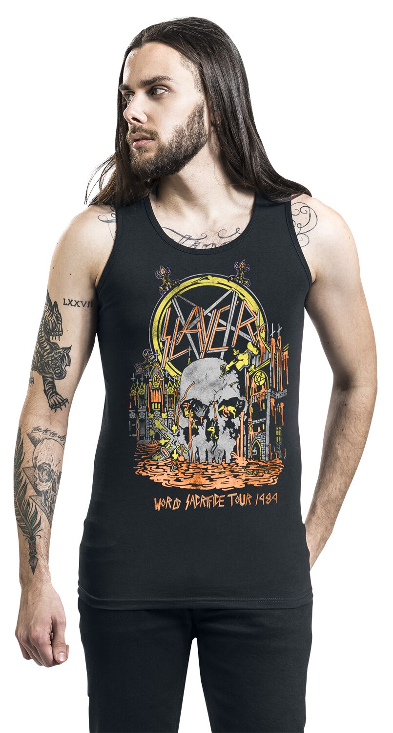 Rock den Metal-Look! Dieses offizielle Slayer Tank Top mit dem klassischen Logo ist perfekt für heiße Tage und heiße Konzerte. Leichtes Material und klassischer Schnitt sorgen für maximalen Tragekomfort. Doppelt genähte Säume garantieren Langlebigkeit auch bei wilden Moshpits. Perfekt für echte Metal-Fans, die ihren Style leben wollen. Einfach anziehen und losheadbangen - so macht Metal Spaß! Ob zum Festival, Konzert oder einfach im Alltag - mit diesem Tank Top zeigst du, wo dein musikalisches Zuhause ist.