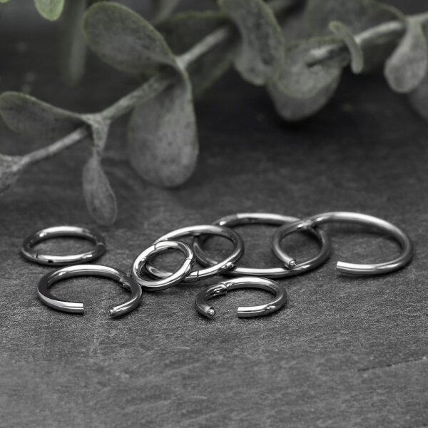 Aus hautverträglichem Chirurgenstahl 316L gefertigt - dem gleichen Material, das auch für chirurgische Instrumente verwendet wird. 36 verschiedene Varianten stehen zur Auswahl: Von zarten 1,2 mm bis kräftigen 2,5 mm Stärken, in Durchmessern von 6-12 mm und in verschiedenen Farben wie Silber, Schwarz, Gold, Blau, Pink oder bunt.
