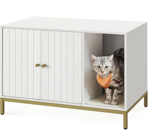 Katzenhalter, dieser Schrank ist die perfekte Lösung um das Katzenklo zu verstecken! Mit 140x48x62 cm bietet er Platz für zwei Katzenklos oder eine Kombination aus Klo und Schlafplatz. In elegantem Weiß-Gold Design - sieht aus wie ein normales Möbelstück!