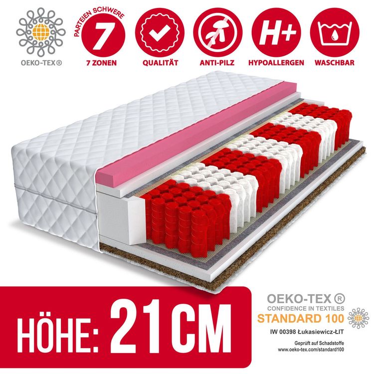 Wow, diese Sleepneo Matratze ist ja ein Traum! Mit 21 cm Höte und 7 Liegezonen bietet sie optimalen Komfort für jede Schlafposition. Ob Bauch-, Rücken- oder Seitenschläfer - hier findet jeder die perfekte Unterstützung.\n\nDas Besondere: Zwei Härtegrade in einer Matratze! Die weiße Seite ist mittelfest (H3), die blaue Seite mit Eierschalen-Schnitt ist etwas fester (H4) und hat sogar einen leichten Massageeffekt. Einfach umdrehen, je nachdem was dir besser liegt.\n\nDer Bezug mit Aloe Vera ist nicht nur superweich, sondern auch antibakteriell und antiallergen. Perfekt für Allergiker! Und das Beste: Er ist bei 60°C waschbar, dank 4-seitigem Reißverschluss leicht abnehmbar.\n\nDie Taschenfedern sind einzeln in Stofftaschen verpackt - da quietscht und knarzt nichts! Belastbar bis 150 kg und mit guter Luftzirkulation für ein angenehmes Schlafklima. Alles OEKO-TEX zertifiziert, also frei von Schadstoffen.\n\nFür erholsamen Schlaf und einen guten Start in den Tag - diese Matratze liefert! Endlich ausgeruht aufwachen und voller Energie in den Tag starten. Einfach himmlisch!
