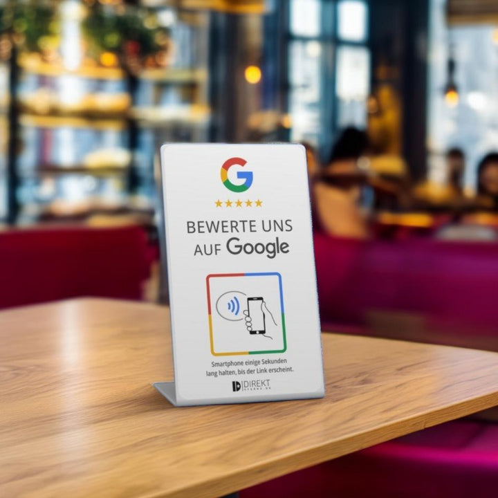 Boah, das ist ja mal genial! Mit diesem Google Bewertung Aufsteller machst du es deinen Kunden super einfach, Bewertungen zu hinterlassen. Einfach ihr Smartphone an den NFC-Chip halten oder den QR-Code scannen - schon landen sie direkt auf deiner Google-Bewertungsseite. Kein langes Suchen mehr! Der Aufsteller in schickem Weiß sieht total professionell aus und passt perfekt auf jeden Tresen, an die Kasse oder den Empfang. Egal ob du ein Restaurant, Friseursalon, Arztpraxis, Café oder Hotel betreibst - damit sammelst du im Handumdrehen mehr positive Bewertungen. Und das Beste: Du musst uns nur Namen und Adresse deines Unternehmens geben, wir verknüpfen den Aufsteller dann direkt mit deinem Google-Profil. So steigerst du deine Online-Sichtbarkeit, verbesserst dein Ranking und gewinnst neue Kunden. Einfacher geht's wirklich nicht! Deine Kunden werden's lieben, weil's so unkompliziert ist, und du freust dich über mehr Bewertungen. Win-win!