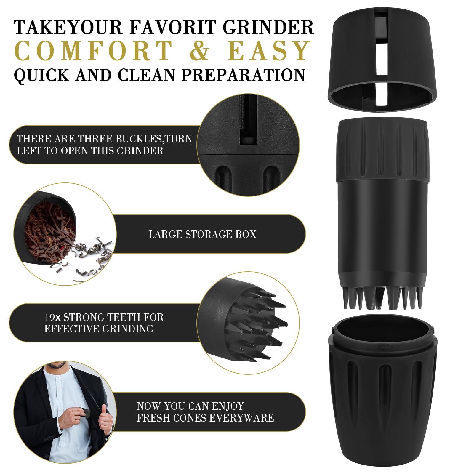 Hey, das Teil ist echt clever: Ein Grinder UND ein Cone-Füller in einem! Musst nicht mehr rumschrauben - einfach die Kräuter rein, drehen und schon hast du perfekt gemahlenes Material. Die Aluminium-Zähne sind super scharf und zerkleinern alles gleichmäßig. Das coole transparente Fenster zeigt dir, wie grob das Mahlergebnis ist. Und das Beste: Passt für alle handelsüblichen Kingsize-Kegelpapiere! Der Nadel-Regler kontrolliert genau, wie viel in den Cone kommt - so verschwendest du nichts. Magnetisch schließt das Ding auch noch, damit nichts ausläuft. Perfekt für unterwegs, ob Festival oder bei Freunden. Einfach genial dieses All-in-One-Teil!