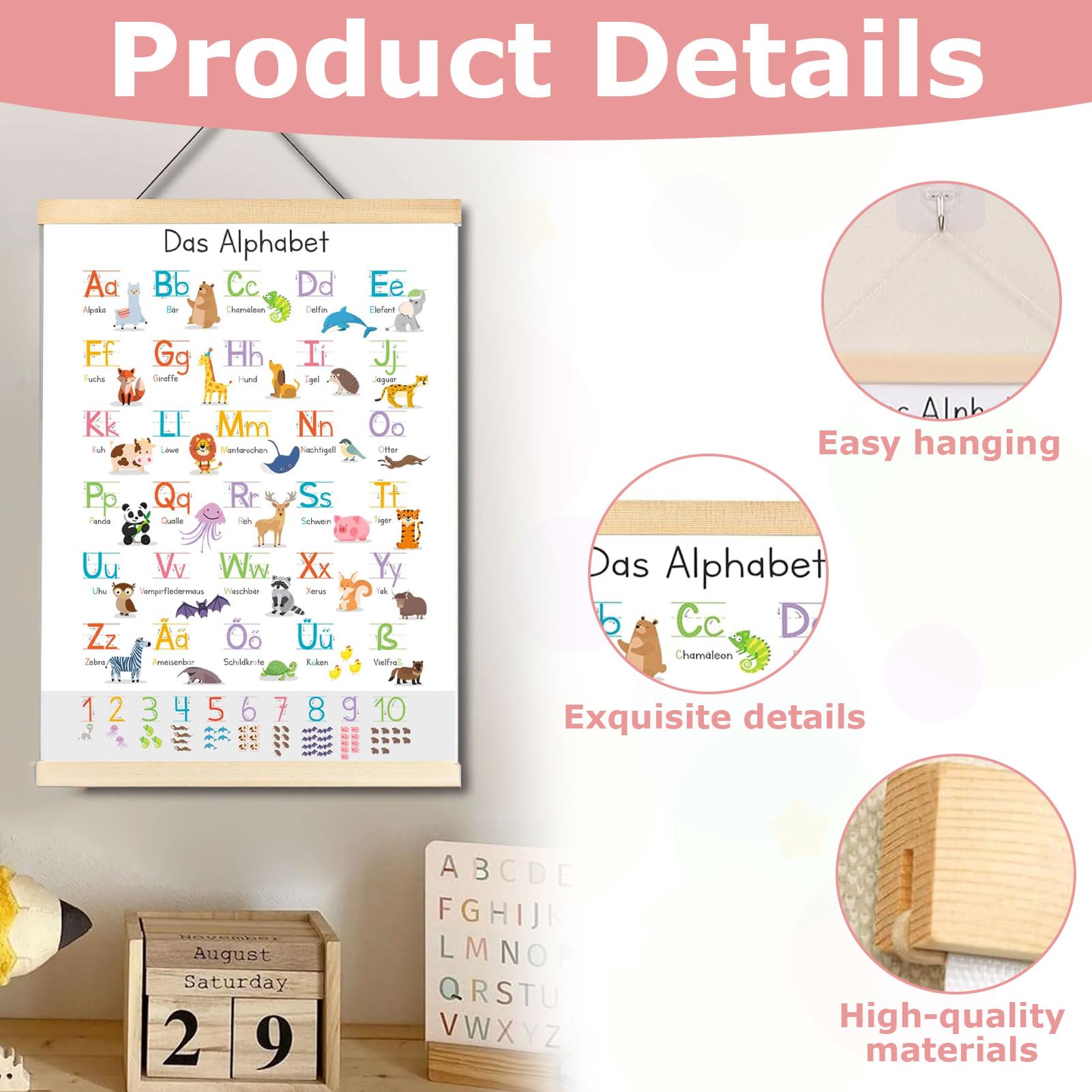 Hey, das ist doch mal ein richtig süßes ABC-Poster für die Kleinen! Mit 31x44 cm passt es perfekt an jede Kinderzimmerwand. Jeder Buchstabe wird von einem niedlichen Tier begleitet - so macht das Alphabet lernen richtig Spaß. Die praktischen Richtungspfeile zeigen den Kids, wie sie die Buchstaben richtig nachzeichnen können. Das Poster ist auf robuste Leinwand gedruckt und hat zwei Holzleisten zum einfachen Aufhängen. Ob fürs Kinderzimmer, den Kindergarten oder die Vorschule - dieses bunte Poster ist einfach perfekt. Und weißt du was? Es ist auch ein super Geschenk zur Einschulung oder für den Kindergartenstart. Die Farben sind richtig kräftig und die Tiermotive total liebevoll gestaltet. So lernen Kinder spielerisch das ABC und haben gleichzeitig eine coole Deko an der Wand. Das Beste: Die Kleinen können immer wieder üben und sich an den süßen Tieren erfreuen. Egal ob für dein eigenes Kind oder als Geschenk - dieses Lernposter kommt immer gut an!