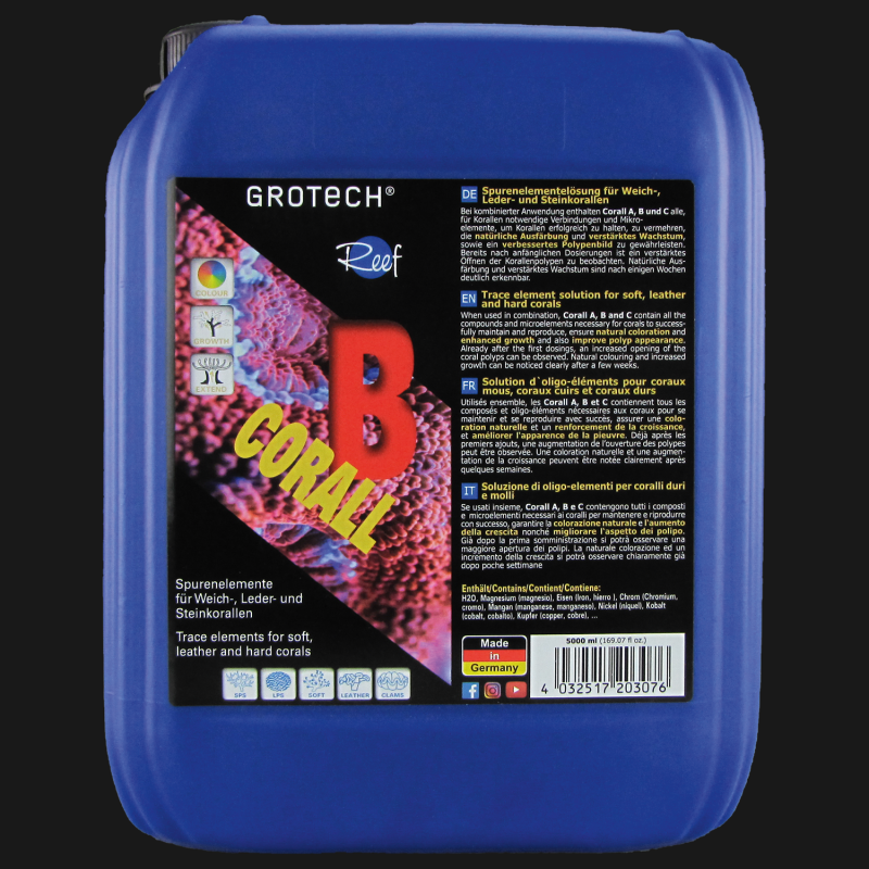 Für prächtige Korallen in deinem Meerwasseraquarium! Grotech Corall C liefert alle wichtigen Spurenelemente wie Fluor, Jod, Bor und Molybdän, die Weich-, Leder- und Steinkorallen (LPS/SPS) für gesundes Wachstum und intensive Farben benötigen. Schon nach den ersten Dosierungen wirst du sehen, wie sich die Korallenpolypen besser öffnen. Ohne Farb- oder Konservierungsstoffe, genau das, was deine Korallen brauchen. Einfach 10ml pro Woche auf 100 Liter Aquarienwasser dosieren - bei gut besetzten Becken. Wichtig: Corall A, B und C nicht mischen, sondern getrennt ins Aquarium geben. Bei Überdosierung einfach Menge reduzieren. Für natürlich leuchtende Korallenfarben und kräftiges Wachstum!