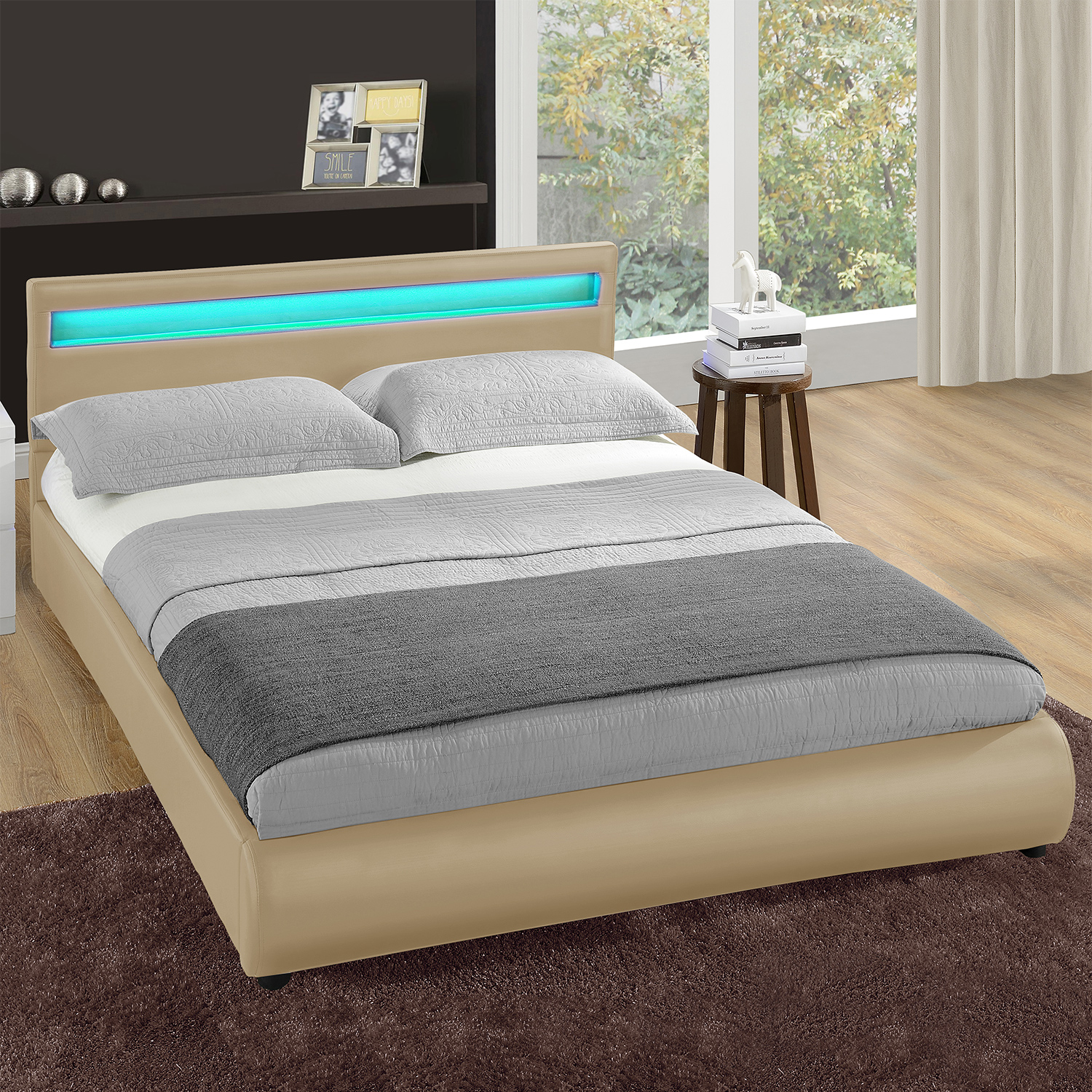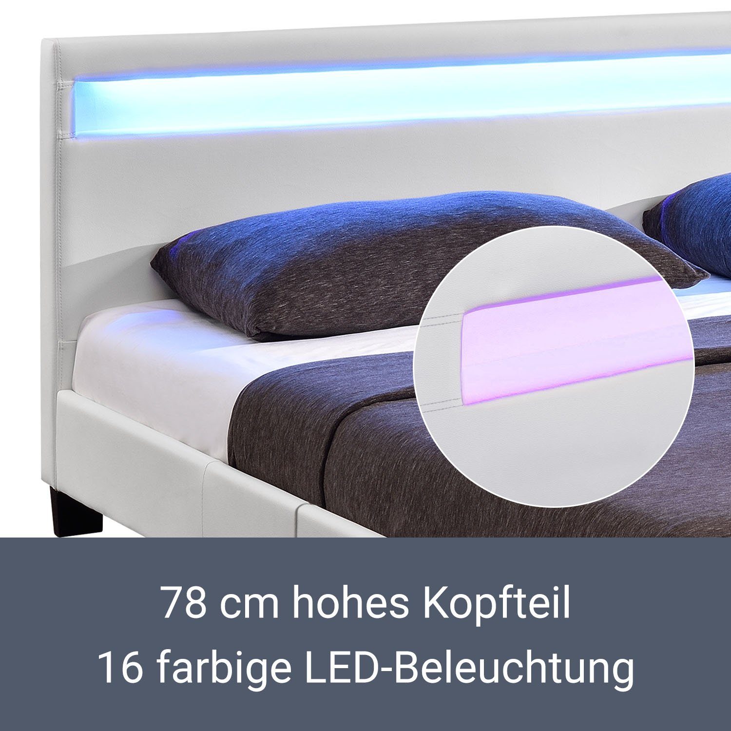 Suchst du ein Bett, das nicht nur super bequem ist, sondern auch richtig was hermacht? Das Corium 'Paris' Polsterbett in weißem Kunstleder ist ein echter Hingucker! Mit extra gepolstertem Kopfteil und RGB LED-Beleuchtung schaffst du dir sofort eine gemütliche Atmosphäre im Schlafzimmer. Die Fernbedienung lässt dich die Farben nach Stimmung wechseln - von romantisch bis energiegeladen. Im Lieferumfang ist alles enthalten: Bett, Standard-Lattenrost und eine hochwertige Kaltschaummatratze 180x200cm. Die Matratze ist allergikergeeignet, atmungsaktiv und bietet exzellente Klimatisierung - im Sommer kühl, im Winter warm. Mit den Außenmaßen von 210x189cm und einer Kopfteilhöhe von 78cm macht das Bett in jedem Raum eine gute Figur. Die stabile Bauweise garantiert langen Schlafkomfort, und die Montage ist simpler als man denkt. Perfekt für alle, die modernes Design und Komfort lieben. Einfach aufbauen, LED-Farbe einstellen und sich auf erholsame Nächte freuen!