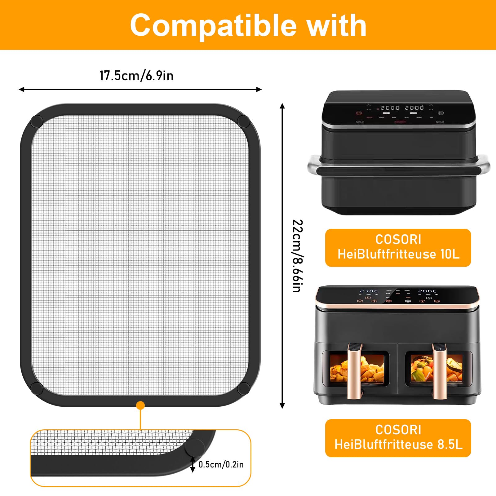 Schütze deine Heißluftfritteuse vor Fettspritzern! Dieser Edelstahl-Spritzschutz für Cosori Airfryer ist genau das, was du brauchst. Speziell designed für die 8,5L und 10,4L Modelle, passt er perfekt und schützt zuverlässig die Heizspirale vor lästigen Fettspritzern. Das feinmaschige Edelstahlgewebe sorgt dafür, dass die Luft trotzdem optimal zirkulieren kann - so wird die Garzeit sogar verkürzt! Das magnetische Design macht die Montage zum Kinderspiel: Einfach anbringen, fertig. Und der silikonummantelte Rand schützt deine Hände vor Verbrennungen beim Abnehmen. Aus lebensmittelechtem, rostfreiem Edelstahl gefertigt, ist er hitzebeständig und super leicht zu reinigen. Im Lieferumfang sind zwei Spritzschütze enthalten - praktisch zum Wechseln. Verlängere die Lebensdauer deiner Cosori Airfryer und genieße entspanntes Kochen ohne lästiges Putzen!