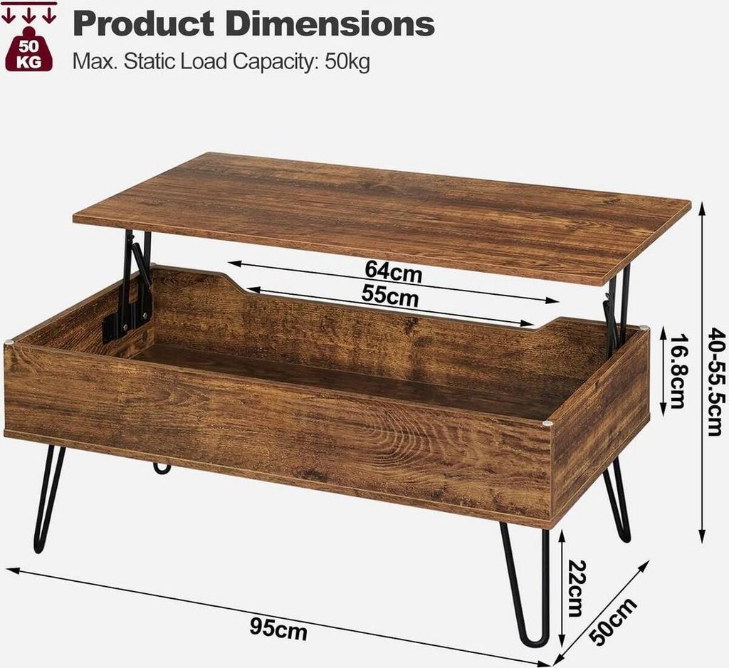 • VEVOR Lift Top Couchtisch 100 Cm - Rustikaler Hubtisch Mit Staufach