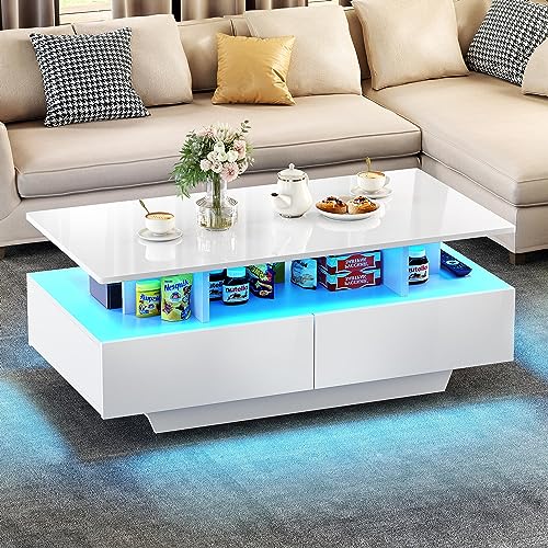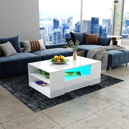 Boah, dieser LED-Couchtisch von YGHQAP bringt richtig Stimmung in dein Wohnzimmer! Mit 16 attraktiven Farben, 4 dynamischen Modi und einstellbarer Helligkeit (per Fernbedienung oder APP) schaffst du die perfekte Atmosphäre - ob für gemütliche Abende oder ausgelassene Partys. Maße: 104x53x46 cm in weiß Hochglanz. Die geräumige Tischplatte bietet Platz für Teegeschirr, Zeitschriften und Fernbedienungen. Dazu kommen ein offenes Fach und 2 Schubladen um alles ordentlich zu verstauen. Die klaren Linien und die helle LED-Beleuchtung verleihen deinem Wohnzimmer einen modernen Farbtupfer. Aus hochwertigem MDF gefertigt - stark, langlebig und leicht zu reinigen. Die Schubladen halten bis zu 50 kg aus und schließen sanft und leise. Wird in zwei Paketen geliefert und ist mit beiliegender Anleitung easy zu montieren. Einfach mit feuchtem Tuch abwischen - schon glänzt er wie neu. Perfekt für Zuhause, Büro oder Geschäft - ein echter Blickfang der auch noch praktisch ist!