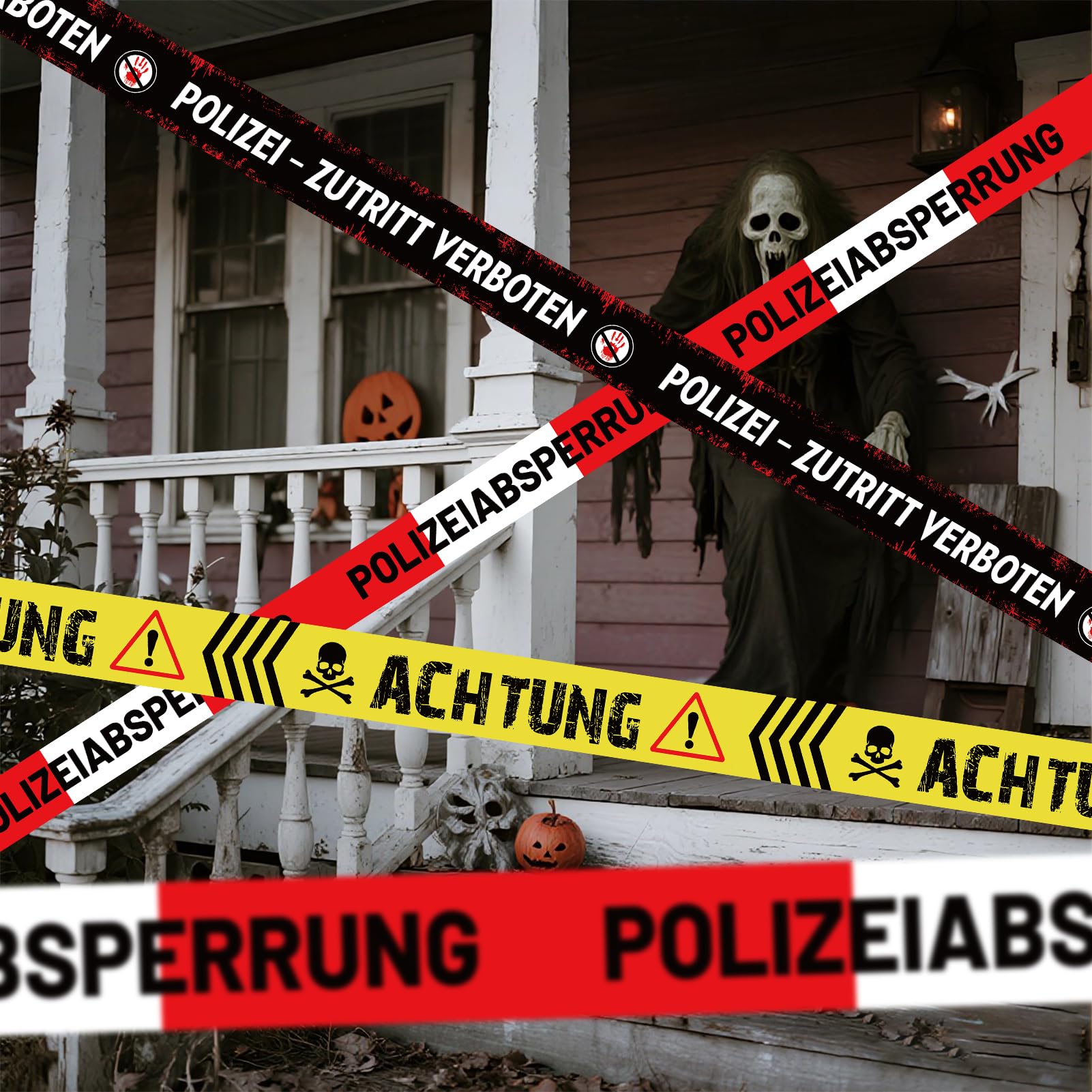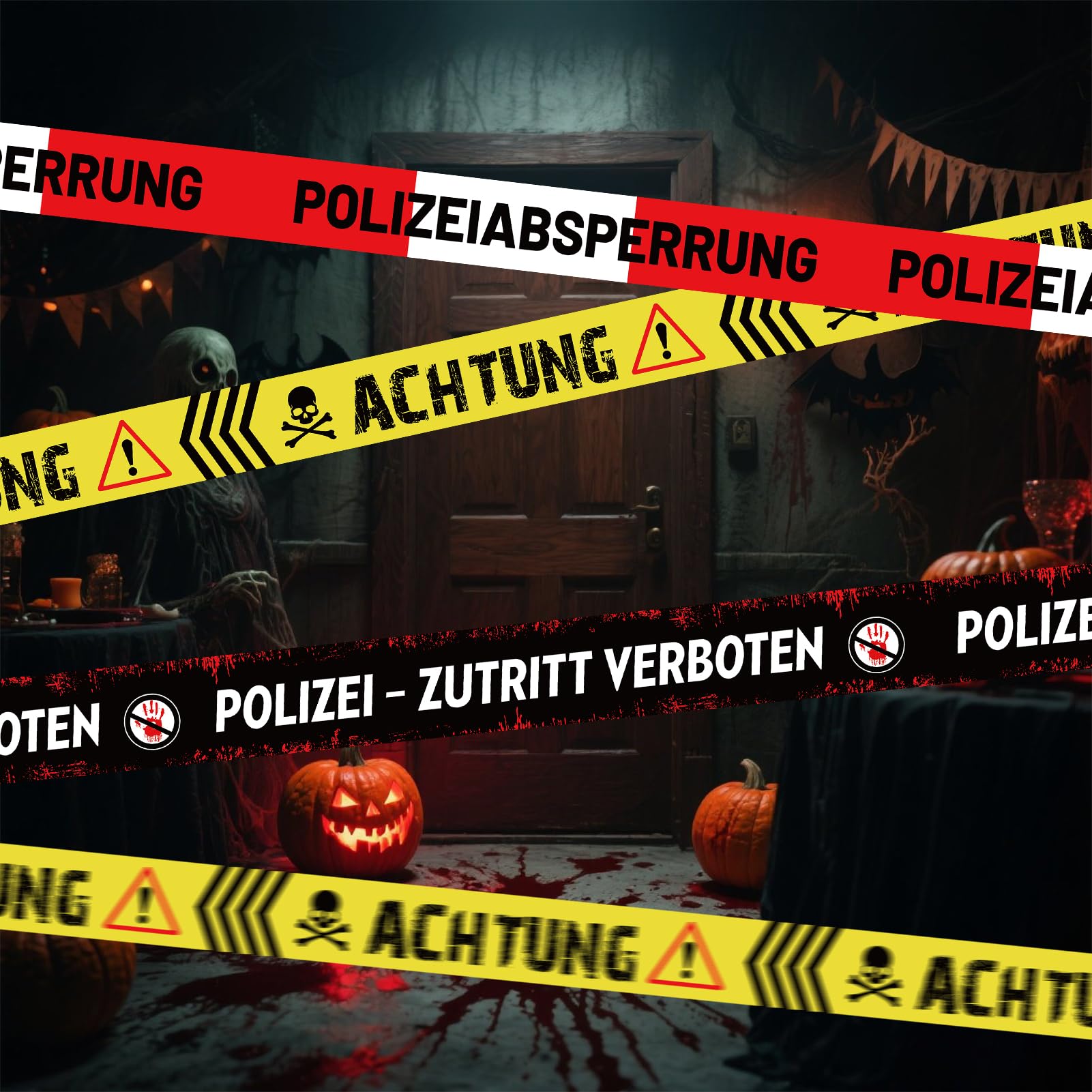 Boah, das ist ja mal richtig gruselig! Dieses Polizei-Absperrband sieht aus wie echt und macht deine Halloween-Party zum absoluten Crime-Scenario. 27 Meter lang mit drei verschiedenen Aufschriften: 'Polizeiabsperrung', 'ACHTUNG!' und 'ZUTRITT VERBOTEN'. Perfekt für Garten, Haustür oder als Zombie-Party-Deko. Das Band ist wetterfest, lässt sich einfach zuschneiden und nächstes Jahr wieder verwenden. Mach dein Zuhause zur gruseligsten Location der Stadt - deine Gäste werden aus dem Staunen nicht mehr rauskommen!