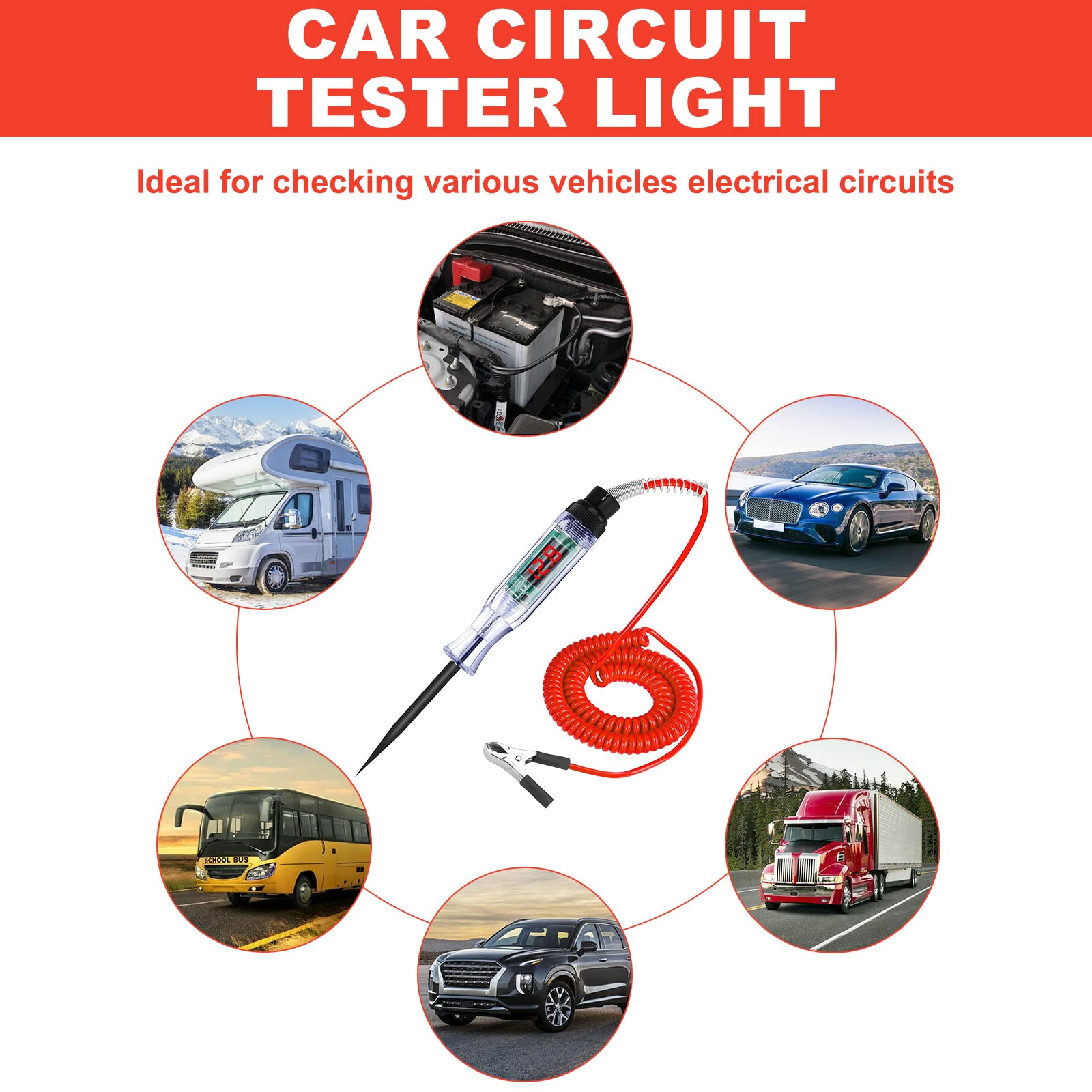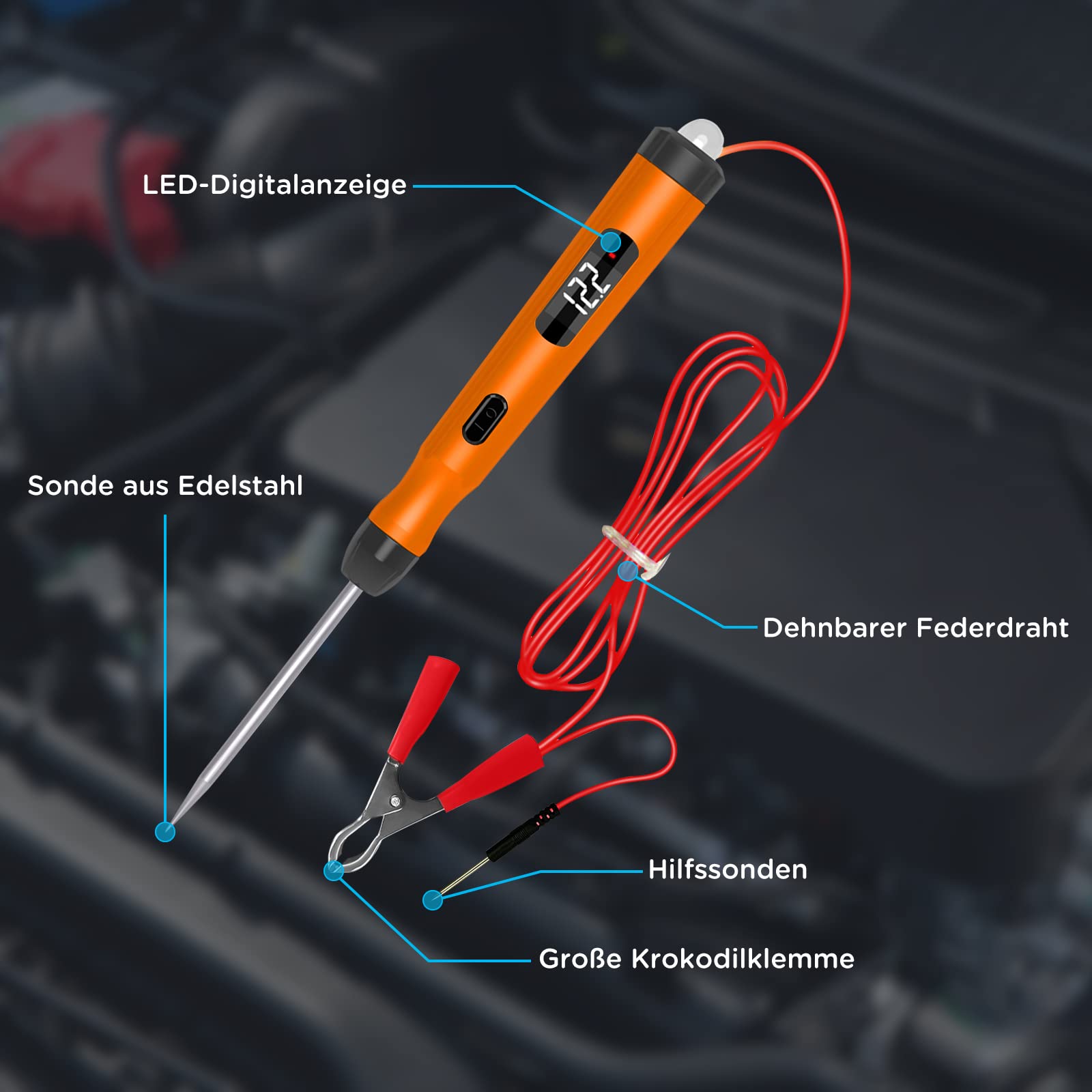 Professionelle Fehlersuche im Auto! Dieser digitale Spannungsprüfer für 3-48V Gleichstrom zeigt Spannungswerte klar auf dem LCD-Display an. Mit langer Metallsonde für enge Stellen und Krokodilklemmen für sicheren Halt. Erkennt Plus- und Minuspol über LED-Anzeige (rot/grün). Perfekt zum Prüfen von Sicherungen, Scheinwerfern, Rückleuchten und allen Stromkreisen. Die isolierten Griffe schützen vor Stromschlägen. Für Pkw, Lkw und Motorräder geeignet. Dein zuverlässiger Helfer für jede Autoreparatur!