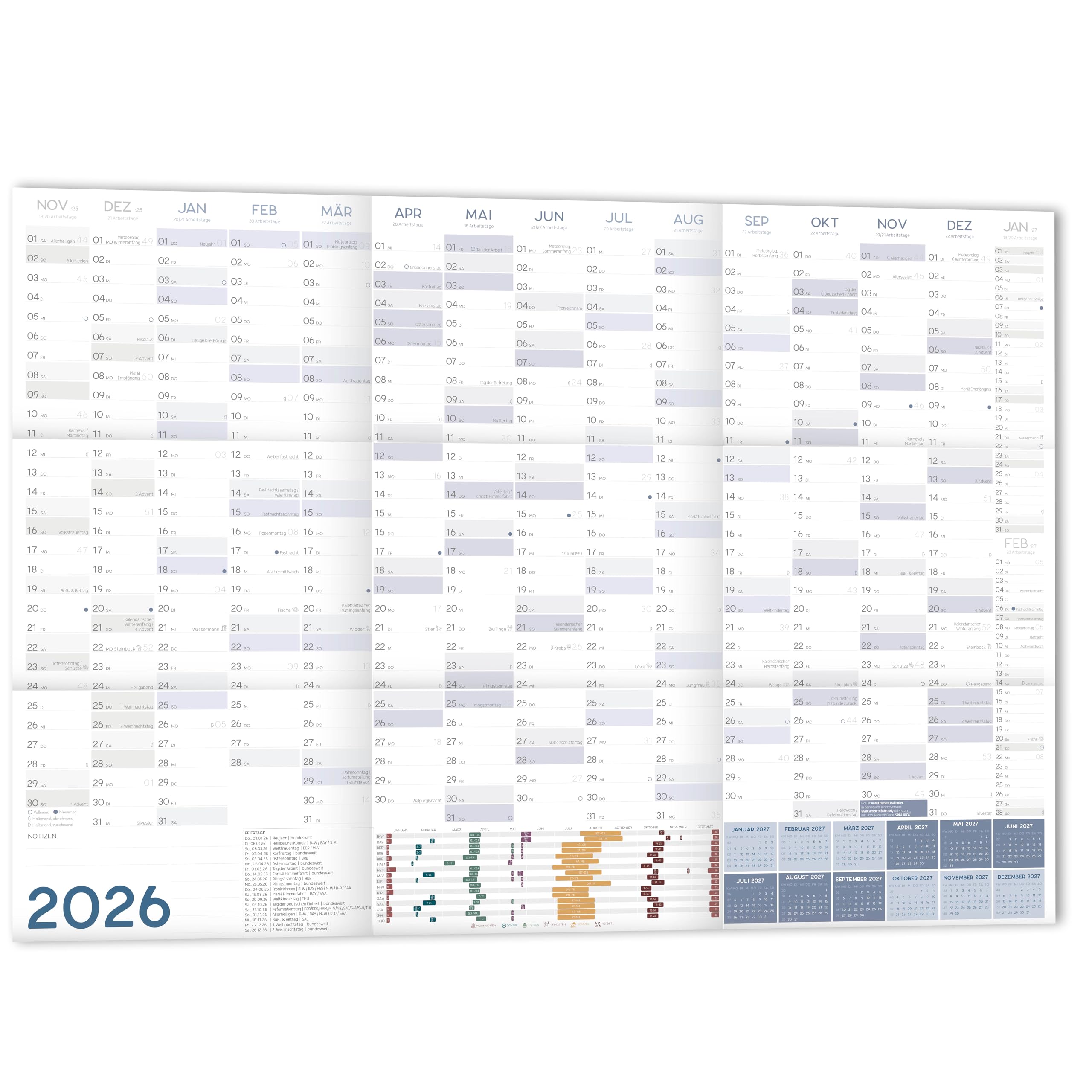 Alles im Blick mit diesem riesigen Jahresplaner 2026 im DIN A1 Format! Mit stolzen 84,1x59,4 cm siehst du das ganze Jahr auf einen Blick - perfekt für Büro, Homeoffice oder die Familien-Küche. Deutsche Feiertage und Kalenderwochen sind schon eingedruckt, die großen Tagesfelder bieten Platz für alle Termine. Das hochwertige 250g Papier ist beschreibbar mit Kugelschreiber, Filzstift oder Marker. Kommt gerollt an - keine lästigen Knicke oder Falten! Einfach aufhängen und sofort losplanen. Farbkodierte Monate sorgen für Übersicht, Wochenstart ist Montag. Made in Germany Qualität, die sich sehen lassen kann!