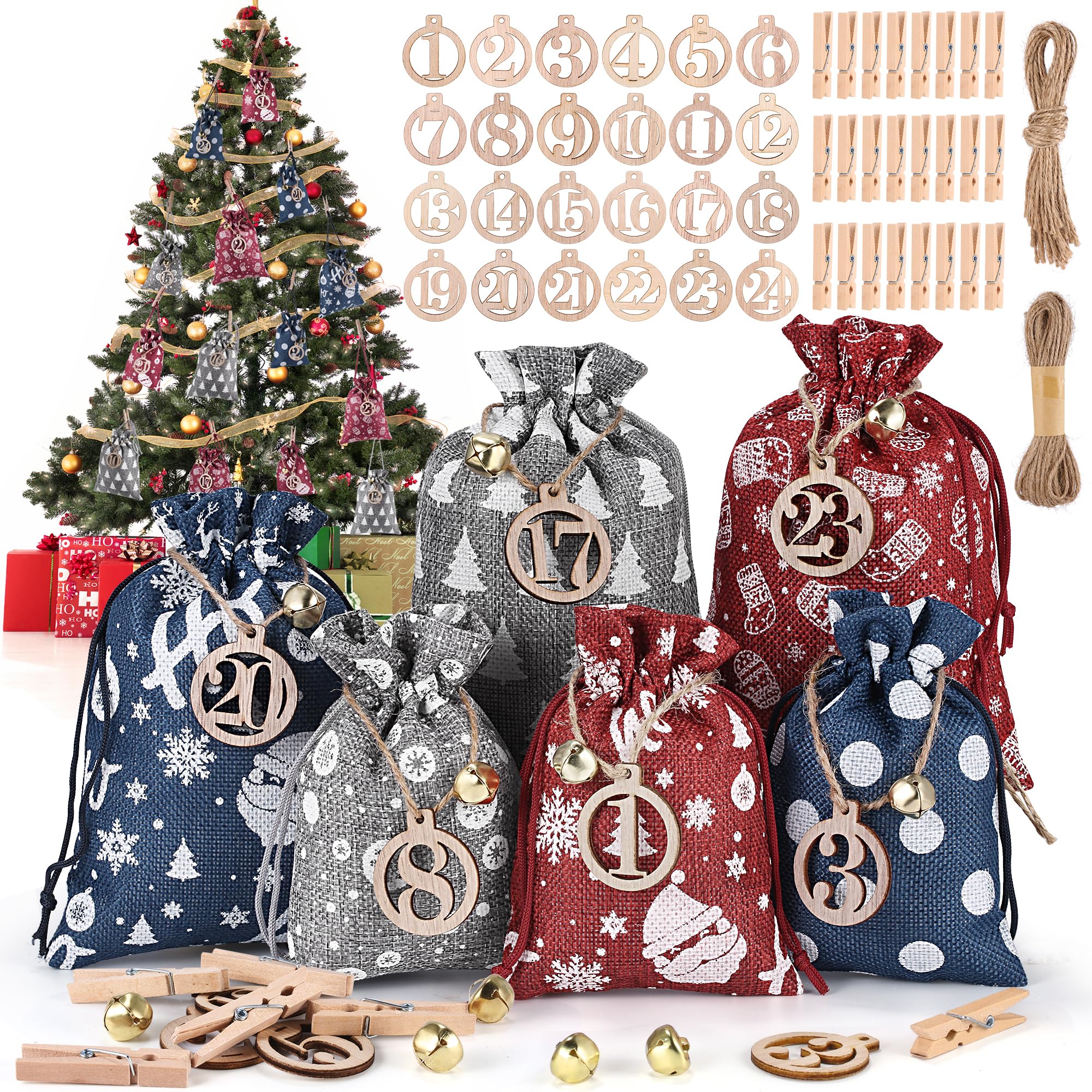Bastel dir deinen persönlichen Adventskalender! Dieses komplett Set hat alles, was du brauchst: 24 hochwertige Stoffbeutel mit aufgedruckten Zahlen, 24 natürliche Holzklammern und 10 Meter Hanfseil zum Aufhängen. Die inkludierte LED-Lichterkette macht die Sache richtig gemütlich. Perfekt für die ganze Familie - füll die Säckchen mit Süßigkeiten, kleinen Geschenken oder lieben Botschaften. Häng sie an den Baum, übers Regal oder an die Wand. Mach die Weihnachtszeit zu deinem persönlichen Highlight! Jedes Jahr wieder verwendbar - nachhaltig und voller Vorfreude.