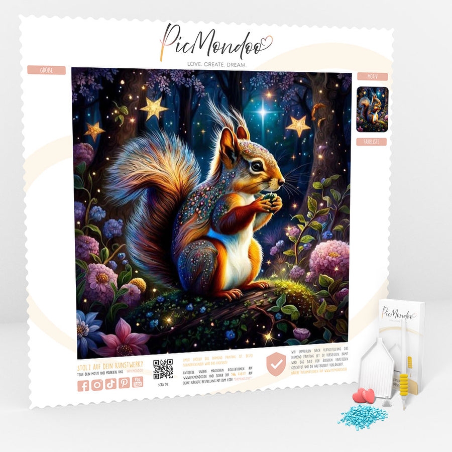 Entspannung pur mit diesem niedlichen Eichhörnchen Diamant Painting! Das 30x30cm große Set bringt dir Stunden voller kreativer Entspannung. Die hochwertige Leinwand hat klare Symbole und Zahlen, sodass du genau weißt, wo welcher Diamant hingehört. Extra plus: 30% mehr Diamanten sind dabei - du musst dir keine Sorgen machen, dass dir welche ausgehen! Die 5D-Diamanten glitzern wunderschön und haften super auf der klebrigen Leinwand. Perfekt zum Abschalten nach einem stressigen Tag, zur Verbesserung der Feinmotorik oder einfach als schönes Hobby. Das fertige Bild ist ein toller Wandschmuck für dein Zuhause oder ein besonderes Geschenk. Für Erwachsene, Senioren und Anfänger gleichermaßen geeignet. Tauche ein in die Welt der Diamant Malerei!