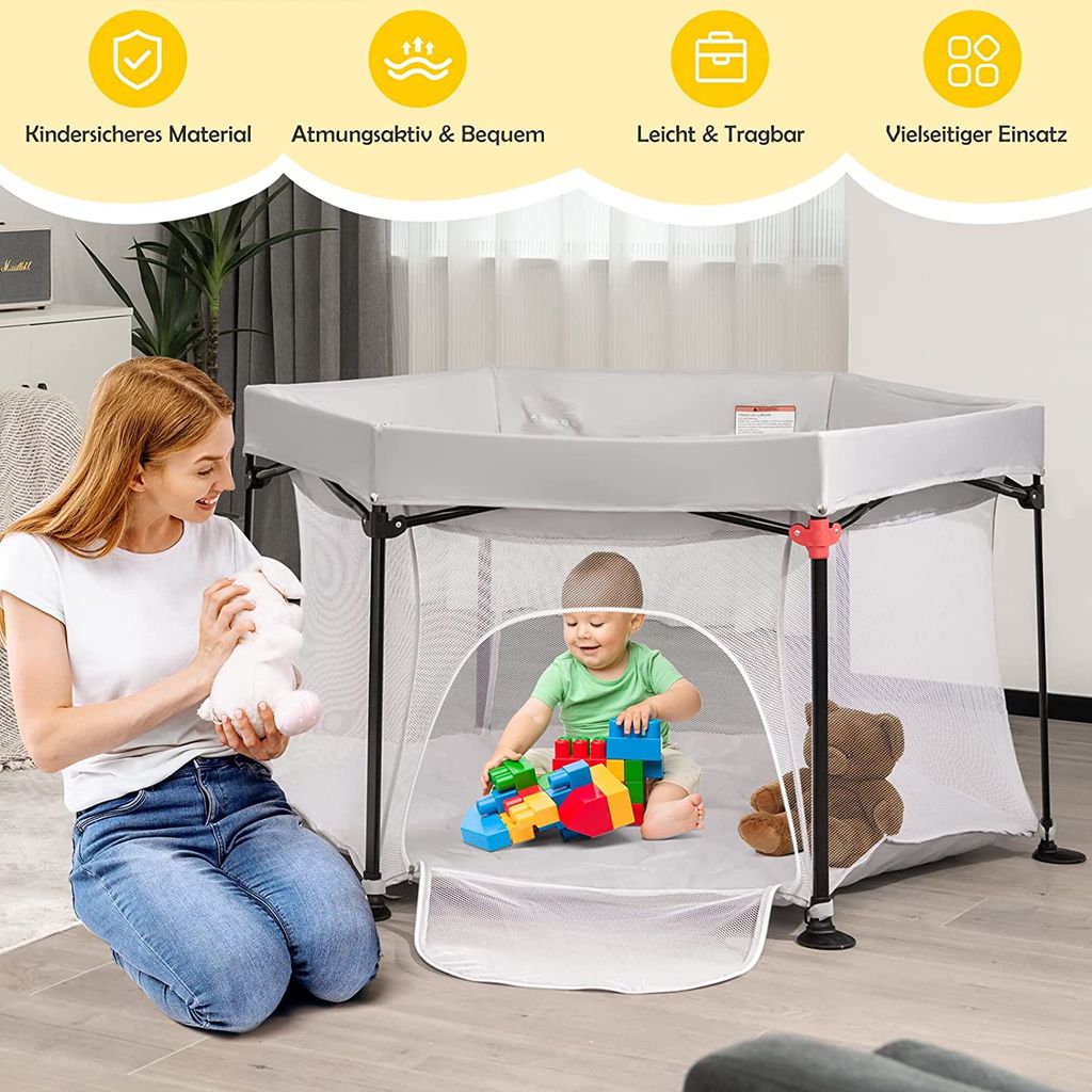 Sicherer Spielspaß für dein Baby! Dieser Laufstall mit 125x125cm bietet jede Menge Platz zum Krabbeln, Spielen und Entdecken. Die Reißverschlusstür ist von innen nicht zu öffnen - super sicher! Aus robustem Oxford-Material und Stahlrohren - hält auch mal was aus. Mit atmungsaktivem Netz an allen Seiten - du hast dein Kleines immer im Blick. Die Saugnäpfe am Boden sorgen für Stabilität. Einfach aufbauen ohne Werkzeug - in wenigen Minuten fertig! Mit Tragetasche für platzsparende Aufbewahrung. Perfekt für Eltern die mal beide Hände frei brauchen. Dein Baby kann sicher spielen während du in Ruhe kochst oder arbeitest.