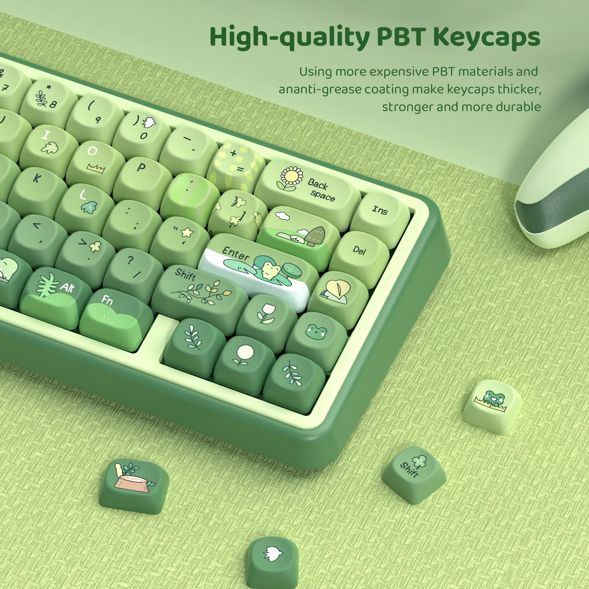 Verwandle deine Tastatur in ein Kunstwerk! Dieses dagaladoo Tastenkappen-Set im Matcha Green Frog Design begeistert mit einem sanften Farbverlauf von Gelb zu Grün. Hergestellt aus hochwertigem PBT-Material, das nicht vergilbt und langlebig ist. Das ergonomische MOA-Profil sorgt für komfortables Tippen auch bei langen Sessions. Die Motive mit Fröschen, Lotusblättern und Regentropfen werden durch Farbsublimation aufgebracht - sie verblassen nicht! Kompatibel mit den meisten mechanischen Tastaturen und MX-Switches. Im Set sind 132 Tastenkappen und ein Entferner enthalten. Perfekt für Gamer, Programmierer und alle, die ihrer Tastatur individuellen Style verleihen wollen. Ein echter Hingucker für deinen Schreibtisch!