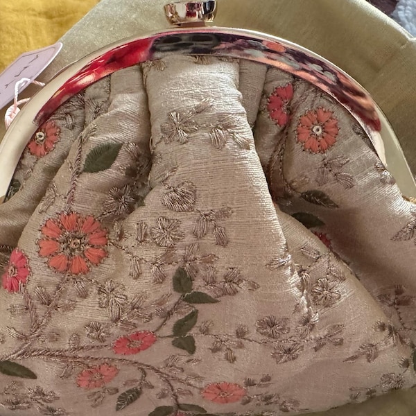 Absolute Traumtasche für besondere Anlässe! Diese handgefertigte Potli-Tasche aus indischem Samt ist ein echter Blickfang. Aufwendig bestickt mit Zari-Fadenarbeit und funkelnden Perlen - jedes Stück ein Unikat! Mit ca. 22x20cm Größe und 44cm Trägerlänge passt Handy, Geld und Kosmetik problemlos hinein. Der praktische Kordelzug verschließt sicher, die Perlenkette lässt sich bequem ums Handgelenk legen. Perfekt für Hochzeiten, Partys oder festliche Events. Ein wunderschönes Geschenk das garantiert beeindruckt!