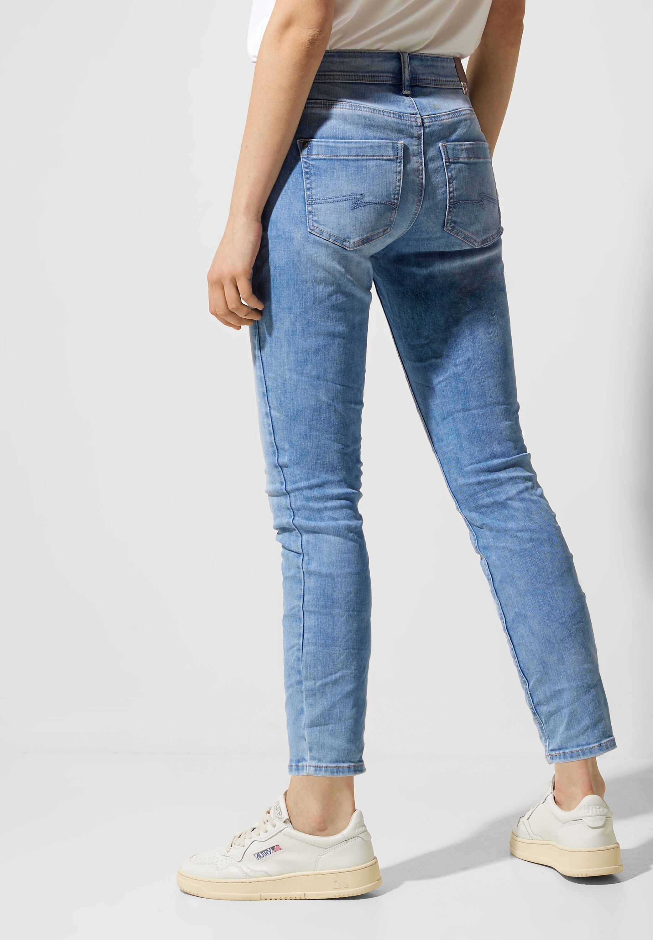 Diese Street One Jeans im York Style ist einfach der Hammer! Die funkelnden Glitzerdetails am Saum machen sie zum absoluten Hingucker. Im schicken Slim Fit mit Mid Waist betont sie deine Figur perfekt - aber dank dem Stretch-Anteil im Baumwollmix fühlt sie sich trotzdem super bequem an. Die blaue Waschung ist total vielseitig und passt zu fast allem in deinem Schrank. Perfekt für den Alltag, aber auch für besondere Anlässe. Bei Größe 29 hat sie eine vordere Schrittlänge von 24,5 cm, eine untere Weite von 14,5 cm und eine Innenbeinlänge von 71 cm - sitzt einfach wie angegossen! Ob mit Sneakern für den lässigen Look oder mit Stiefeletten für den ausgehenden Abend - diese Jeans macht immer eine gute Figur. Strahle mit jedem Schritt - die Glitzerdetails sorgen für Aufmerksamkeit!