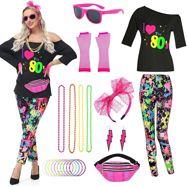 Back to the 80s! Dieses komplett Outfit-Set macht dich zur Königin der Retro-Party. 22 Teile in knalligen Neonfarben - da wirst du garantiert zum Hingucker!