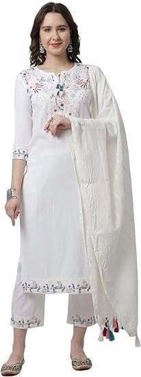 Im Set dabei: die wunderschöne Off-White Kurti, weiße Hose und ein eleganter weißer Dupatta. Zusammen ergeben sie einen harmonischen Look, der sowohl traditionell als auch modern wirkt.