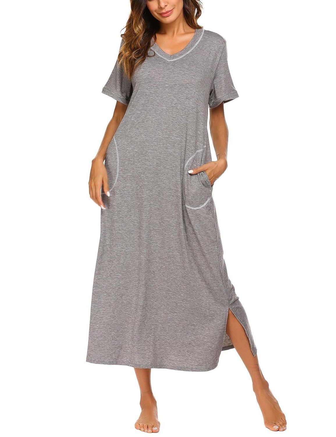 So gemütlich kann Schlafen sein! Dieses bezaubernde Nachthemd aus 95% Baumwolle fühlt sich an wie eine Umarmung. Der verführerische V-Ausschnitt mit zarter Spitze und die transparenten Spitzenbündchen an den Ärmeln verleihen dem Schlafshirt eine romantische Note. Dabei bleibt es total praktisch - die knielange Länge und langen Ärmel geben perfekten Komfort für kühlere Nächte. Die hochwertige Baumwoll-Qualität ist seidig weich, temperaturausgleichend und besonders hautfreundlich, ideal auch für sensible Haut. Einfach in der Pflege: 30°C Maschinenwäsche, trocknergeeignet und bügelfrei! Erhältlich in klassischen Farben wie Kobaltblau, Marineblau und Grau, in Größen von XS bis XXL. Perfekt als Nachtwäsche oder auch mal als lässiges Lounge-Kleid für gemütliche Abende zu Hause. Einfach reinchlüpfen und wohlfühlen!