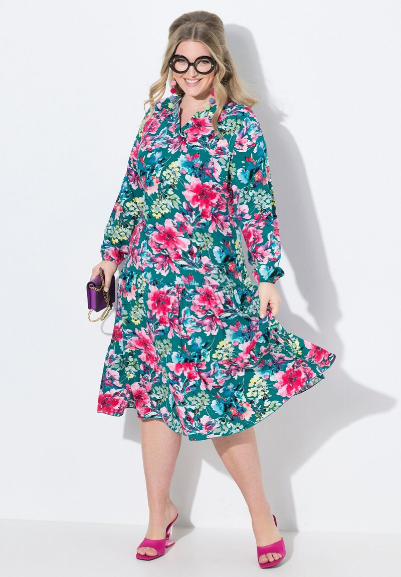 • MIAMODA Damen Midikleid Übergrößen - Blumenmuster Viskose Mit Volantsaum