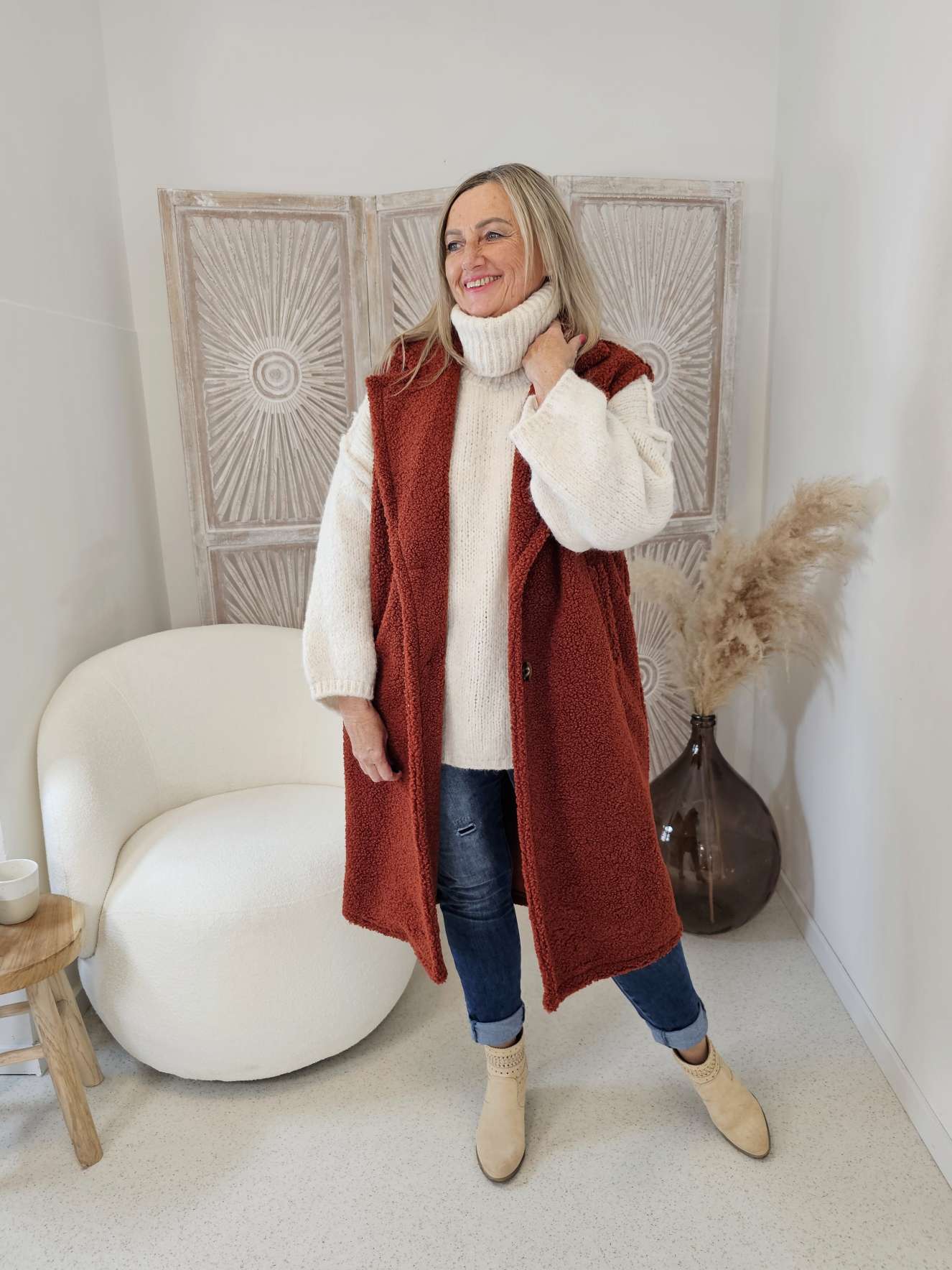 Mädels, diese Teddy Weste ist einfach der absolute Hit für den Winter! Aus super weichem Teddyfleece - fühlt sich an wie eine kuschelige Umarmung! Ärmellos mit praktischem V-Ausschnitt - perfekt zum Überziehen über Pullis oder Shirts! Mit Kapuze für extra Schutz bei Wind und Wetter! Die lockere Passform sitzt super bequem und schmeichelt jeder Figur! In Größen von S bis XXL - für jede was dabei! Perfekt für Outdoor-Aktivitäten, Spaziergänge oder einfach für gemütliche Tage zu Hause! Lässt sich super kombinieren - ob mit Jeans, Leggings oder Röcken! Und das kurze Design ist total modern und lässig! Einfach ein Must-Have für die kalte Jahreszeit! Damit bist du nicht nur warm angezogen, sondern siehst auch noch mega stylisch aus! Ob für den Stadtbummel oder den Winterurlaub - diese Weste macht immer eine gute Figur!