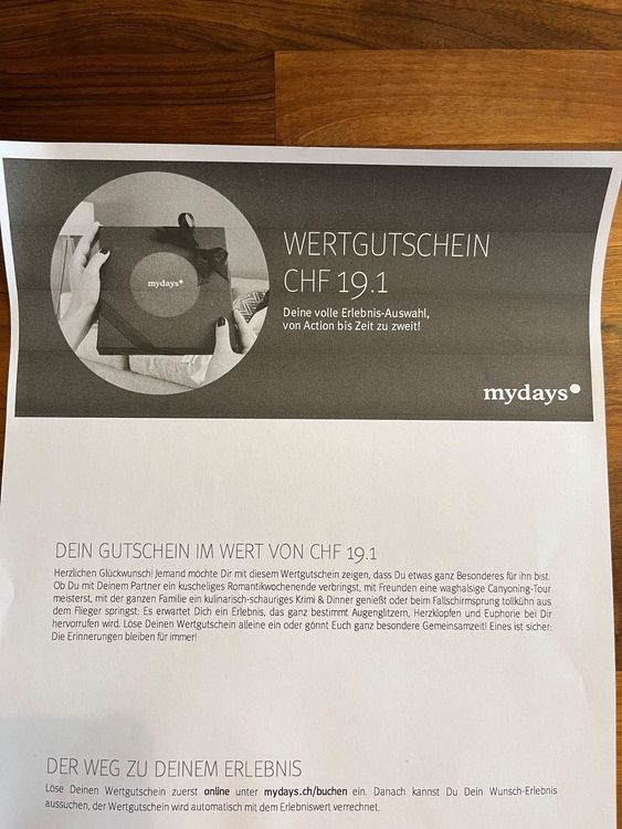 Weißt du nicht, was du schenken sollst? Der mydays Wertgutschein ist die Lösung! Damit schenkst du nicht irgendwas, sondern unvergessliche Erlebnisse. Der Gutschein ist 3 Jahre gültig und kann unter über 4.500 verschiedenen Aktivitäten ausgewählt werden - ob Fallschirmspringen, Wellness-Wochenende oder Kochkurs. Einfach auf mydays.de den Code eingeben, Traumerlebnis aussuchen und Termin buchen. Der Gutschein kommt hochwertig gedruckt im Geschenkumschlag - perfekt zum Überreichen. Kein Stress mit Größen oder Farben, einfach das richtige Geschenk für jeden Anlass. Ob Geburtstag, Jubiläum oder einfach so - mit diesem Gutschein machst du garantiert alles richtig! Der Beschenkte kann sich genau das aussuchen, was ihm Freude bereitet. Kein Umtauschen, kein Ärger - nur pure Vorfreude! Einfach online einlösen und los geht das Abenteuer. So macht Schenken wieder Spaß!
