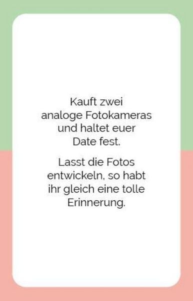 Bringt wieder mehr Romantik in eure Beziehung! Dieses We Time Paarspiel vom erfahrenen Paartherapeuten Carsten Müller bietet 52 kreative Date-Ideen für ein ganzes Jahr voller Überraschungen. Perfekt für Frischverliebte und Langzeit-Paare gleichermaßen. Einfach eine Date-Karte und eine Challenge ziehen - schon habt ihr ein besonderes Erlebnis vor euch. Mit 110 Karten und spannenden Gesprächsimpulsen entdeckt ihr euch neu. Ob zum Jahrestag, Valentinstag oder einfach so - schenkt euch quality time! Für 2 Personen ab 16 Jahren. Praktische Box, ideal für zu Hause oder unterwegs. Einfach ziehen und loslegen!
