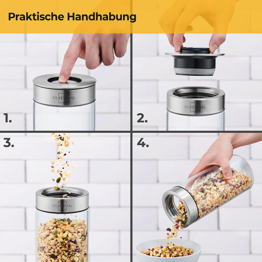 Perfekt für die Küche! Dieses praktische Vorratsglas fasst 1085ml und ist ideal für Bonbons, Kekse, Backzutaten oder Gewürze. Mit dicht schließendem Deckel und Gummiring - so bleiben deine Vorräte lange frisch und aromatisch. Maße: Höhe 181mm, oberer Durchmesser 99mm, unterer Durchmesser 118mm. Aus klarem Glas, sodass du den Inhalt immer gut siehst. Super für die Aufbewahrung in der Küche, im Vorratsschrank oder als dekorative Dose auf der Theke. Auch toll als Geschenkverpackung für selbstgemachte Leckereien. Ein echter Klassiker, der in keiner Küche fehlen sollte. Ordnung und Frische für deine Vorräte!