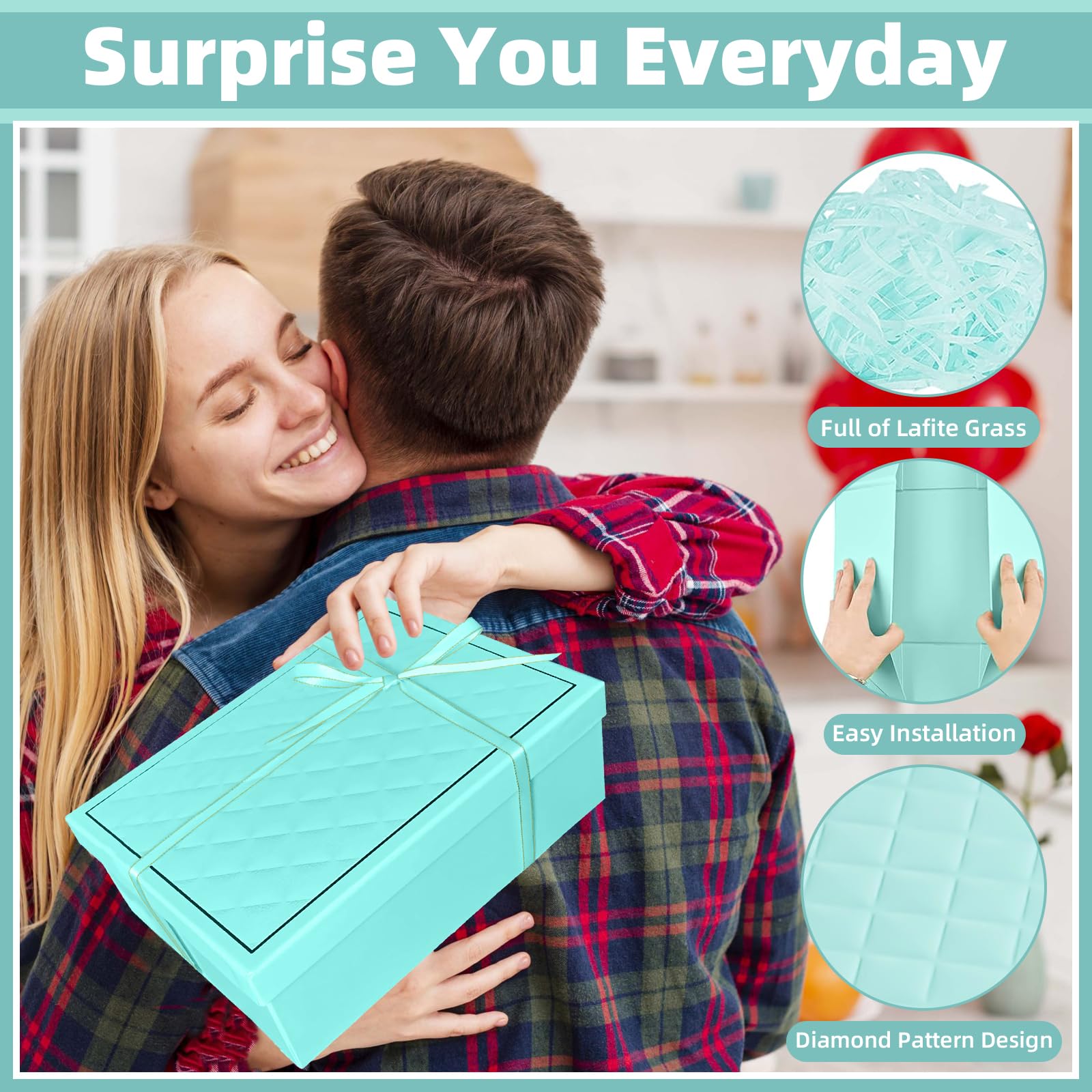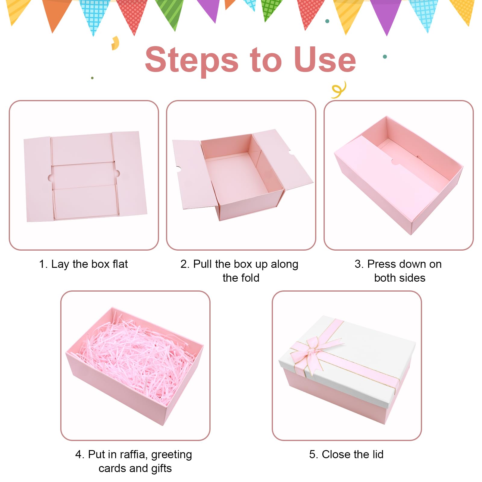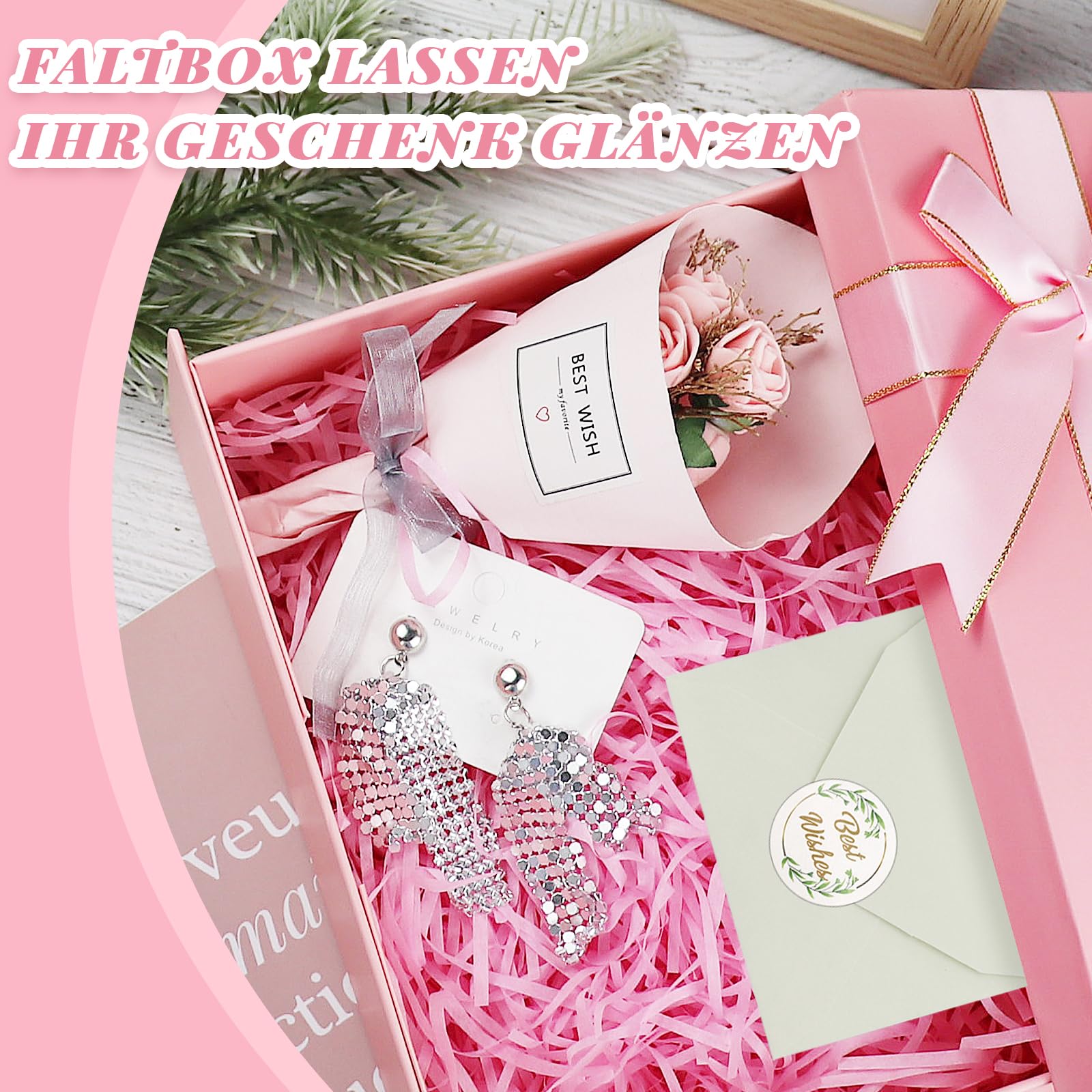 Verpacke deine Geschenke stilvoll mit dieser wunderschönen faltbaren Geschenkbox! Mit den Maßen 25x18x8.5cm bietet sie genug Platz für Kosmetik, Schmuck, kleine Elektronik oder andere besondere Geschenke. Das Set enthält alles, was du brauchst: die Box mit Deckel, ein hübsches Schleifenband, 50g Raffia für die Deko und eine passende Grußkarte. Das geniale faltbare Design macht die Box super platzsparend - einfach zusammenklappen und lagern, wenn du sie nicht brauchst. Wenn dann Überraschung ansteht, faltest du sie in Sekunden ohne Kleber auf. Das elegante Rautenmuster und die hochwertige verstärkte Pappe verleihen deinem Geschenk einen luxuriösen Look. Perfekt für Geburtstage, Weihnachten, Valentinstag, Hochzeiten oder einfach als Überraschung für liebe Menschen. Die rosa Farbe ist besonders hübsch für feminine Geschenke. Mit der beiliegenden Schleife und dem Raffia gestaltest du im Handumdrehen eine professionell aussehende Geschenkverpackung, die garantiert beeindruckt!