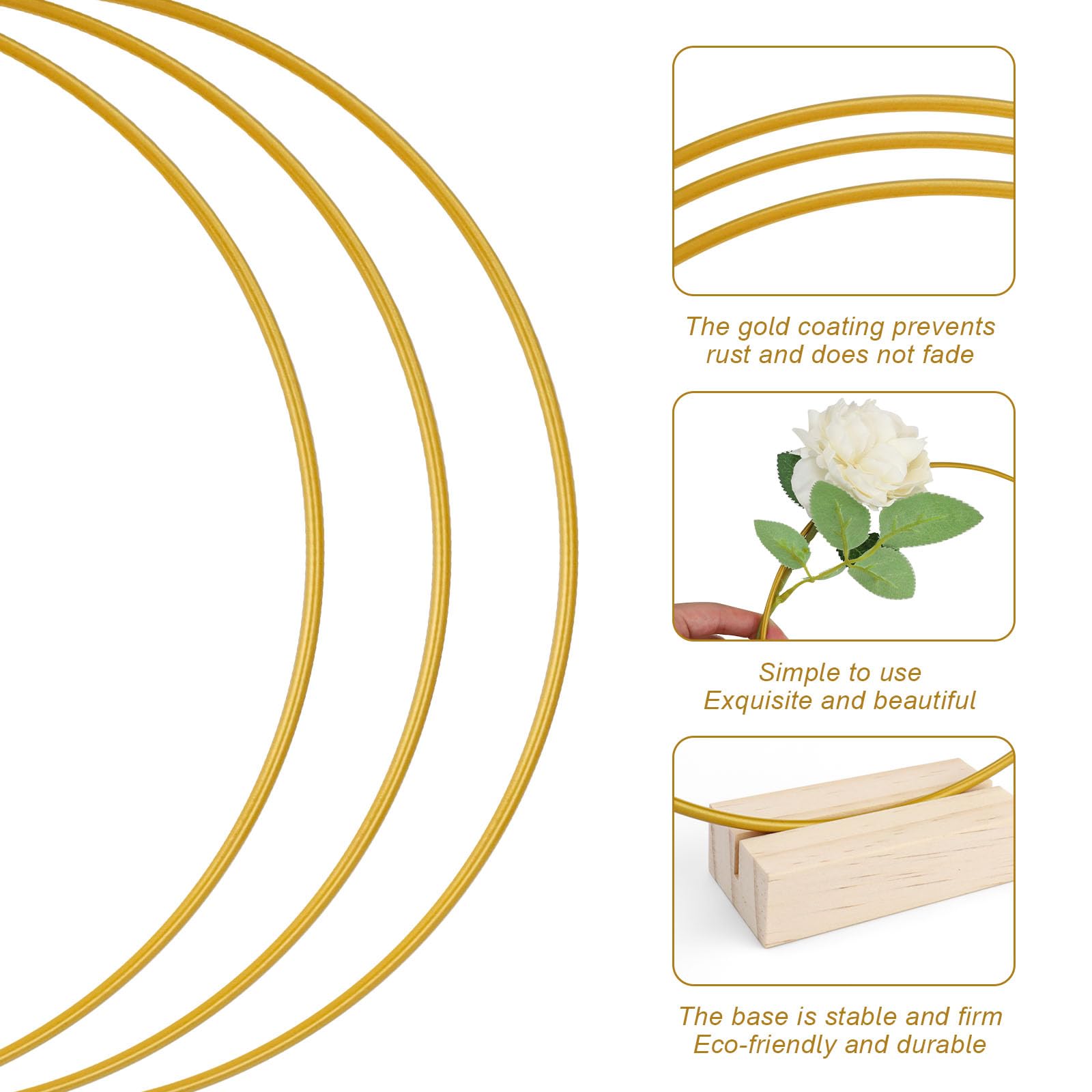 Oh, wie hübsch! Dieser goldene Deko-Ring mit Standfuß ist total vielseitig für alle möglichen Anlässe. 30cm Durchmesser, aus robustem Metall (ca. 5mm stark) - hält ewig! \\n\\nPerfekt für Trockenblumen wie Pampasgras, Lagurus oder Phalaris. Einfach die Blumen drumherum arrangieren und du hast eine traumhafte Tischdeko im Boho-Stil. \\n\\nIdeal für Hochzeiten, Geburtstage, oder einfach als Deko fürs ganze Jahr. Im Advent mit Kugeln und Lichterkette, zu Ostern mit Eiern - deiner Kreativität sind keine Grenzen gesetzt! \\n\\nDer rechteckige Metallfuß macht ihn super stabil. Kann mit Bändern, Kordeln oder was dir einfällt verziert werden. Einfach ein Basic, das du immer wieder neu gestalten kannst. Ab 14 Jahren, kein Spielzeug - aber perfekt für DIY-Fans!
