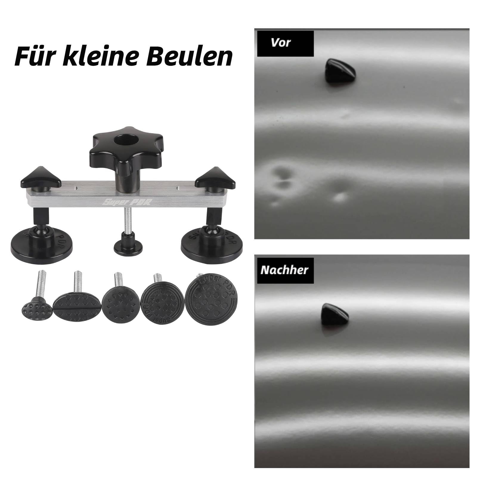 Kennst du das? Eine nervige Delle im Auto, und die Werkstatt verlangt ein Vermögen? Mit diesem Profi-Set kriegst du Beulen selbst raus, ohne den Lack anzukratzen! Perfekt für größere Dellen nach Parkschäden oder kleine Hagelspuren. Das Tolle: Du hast verschiedene Zuglaschen zur Auswahl - für runde oder längliche Dellen immer das passende Werkzeug dabei. Einfach die Stelle sauber machen, die richtige Unterlegscheibe wählen (sollte etwas kleiner als die Delle sein) und mittig aufsetzen. Mit dem starken Zugmechanismus ziehst du die Beule Stück für Stück raus. Spart echt Zeit und Geld - und du brauchst keine Vorkenntnisse. Übrigens: Die Brückenzieher sind speziell für Mini-Dellen entwickelt, wie sie oft bei Hagel entstehen. So bekommst auch dein Auto wieder seine ursprüngliche Form zurück, ganz ohne teure Werkstattbesuche!