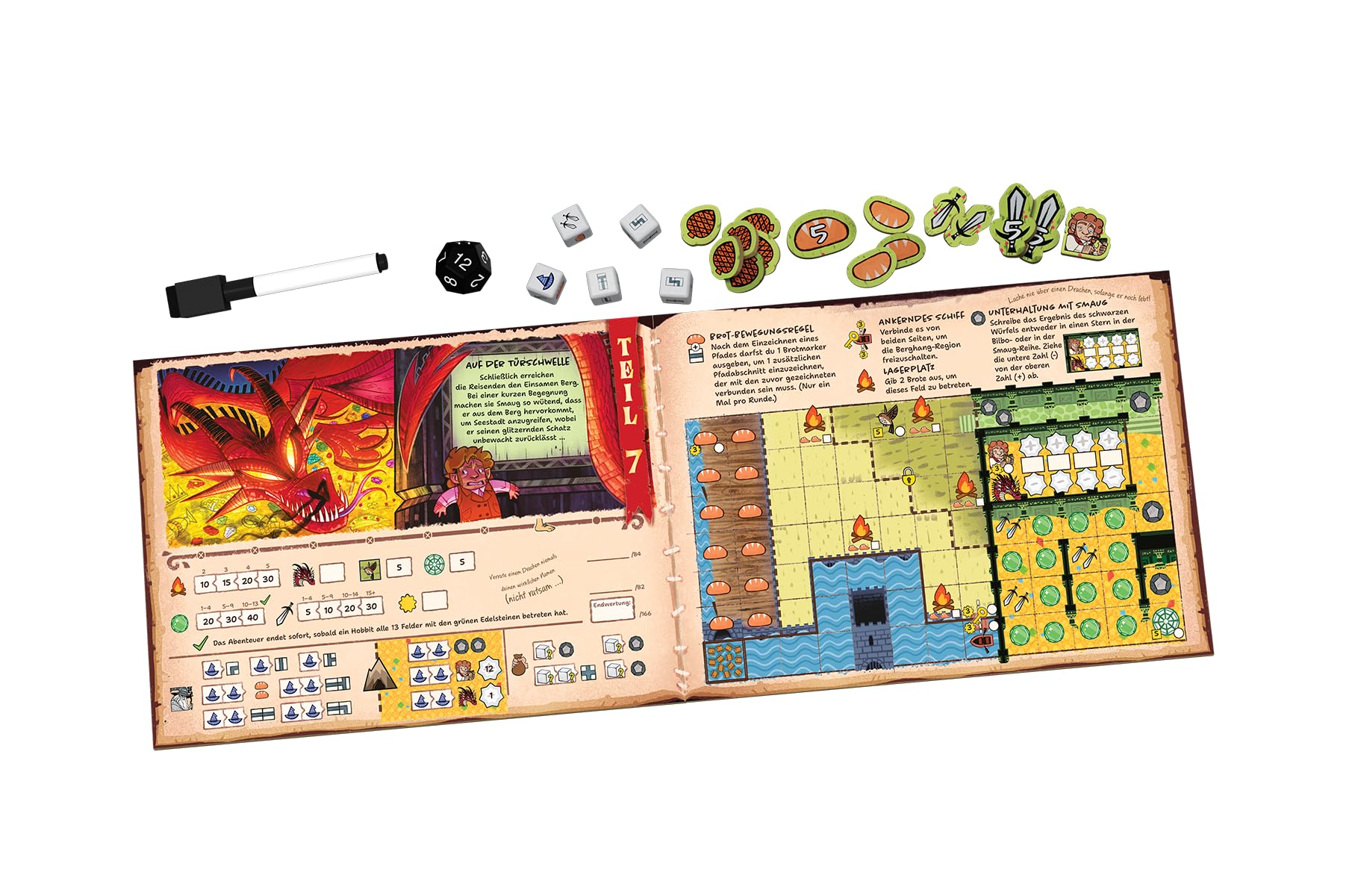 Begib dich auf ein episches Abenteuer in Mittelerde! Dieses Roll & Write Spiel nimmt dich mit auf Bilbos Reise zum Einsamen Berg. Für 1-4 Spieler ab 10 Jahren - perfekt für Familien oder Solo-Spieler. In 8 spannenden Kapiteln triffst du auf Trolle, Orks und natürlich Smaug den Drachen! Würfle die Würfel, zeichne deinen Weg im Abenteuerbuch und sammle Ressourcen. Mit abwischbaren Filzstiften kannst du immer wieder von vorne beginnen. Die Regeln werden von Kapitel zu Kapitel anspruchsvoller - so bleibt es spannend! Ob gemeinsam oder alleine - dieses Spiel bietet stundenlangen Spielspaß in Tolkiens Welt. Auf nach Abenteuer!