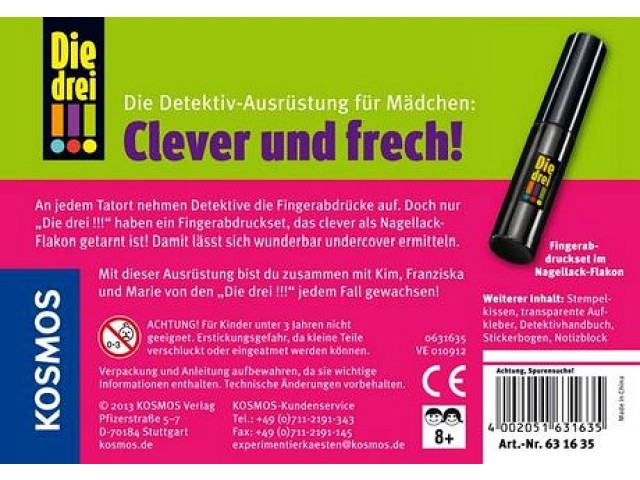Jetzt wird's spannend! Mit diesem Detektiv-Set von Die DREI !!! kannst du echte Fälle lösen wie deine Lieblingsheldinnen. Das besondere Highlight: Das Fingerabdruck-Pulver ist clever in einer Nagellack-Flasche versteckt - so merkkt niemand, dass du auf Verbrecherjagd bist! Sammle Fingerabdrücke, analysiere sie und löse die mysteriösen Fälle. Alles verpackt in der coolen Die DREI !!!-Dose, die selbst schon wie ein Geheimversteck aussieht. Perfekt für Mädchen ab 8 Jahren, die Abenteuer lieben. Aber Vorsicht: Enthält kleine Teile, also nicht für Kinder unter 3 Jahren geeignet. Schnapp dir deine Freundinnen und gründet euren eigenen Detektiv-Club! Wer weiß, welchen spannenden Fall ihr als nächstes lösen werdet? Das macht nicht nur Spaß, sondern trainiert auch deine Beobachtungsgabe. Auf die Plätze, fertig, ermitteln!