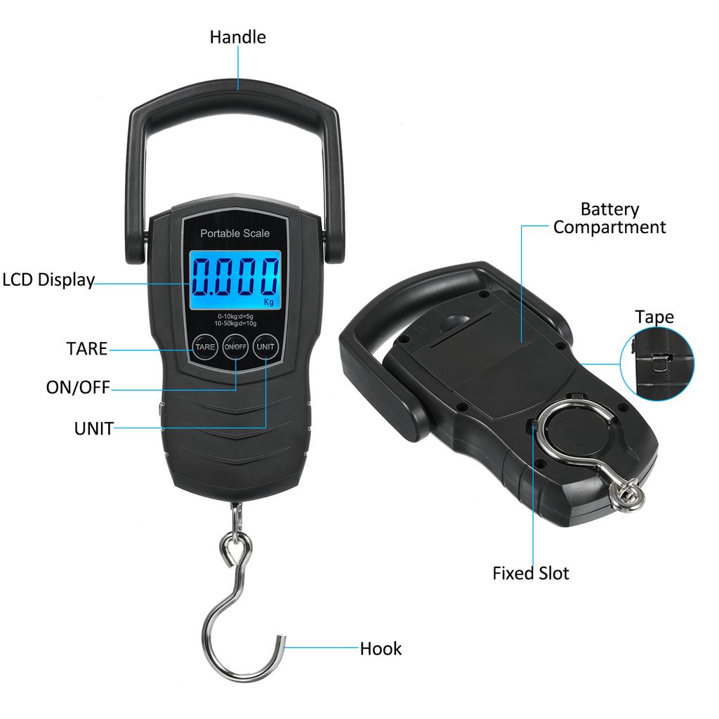 Reise ohne Überraschungen! Diese digitale Kofferwaage misst bis zu 50 kg (in 10g-Schritten) und zeigt das Gewicht auf dem beleuchteten LCD-Display an. Mit Tara-Funktion, großem Edelstahlhaken und vier Einheiten (kg, lb, oz, jin). Maße: 12,5x7x2,3 cm – handlich und immer dabei. Betrieb mit 2 AAA-Batterien (nicht inkl.). Nie wieder Probleme mit Übergepäck – ob im Urlaub oder auf Geschäftsreise!