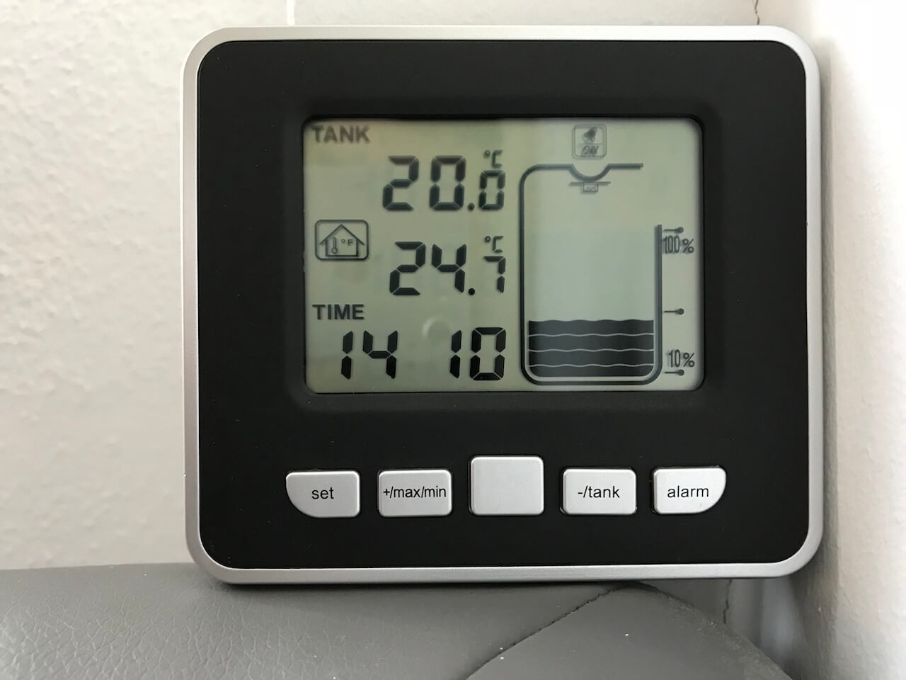 Willst du immer wissen, wie voll dein Wassertank ist? Der EffiFish Füllstandsmesser zeigt es dir genau! Kabellos funktioniert er bis zu 100 Meter - du siehst also vom Haus aus, was im Tank los ist. Das LCD-Display zeigt dir den Wasserstand in 5 Stufen an (100%, 75%, 50%, 25%, leer) und du kannst Alarme für zu hohe oder zu niedrige Wasserstände einstellen. Außerdem misst er sowohl die Wassertemperatur als auch die Raumtemperatur - mit Min/Max-Aufzeichnung. Der Sender kommt auf den Tank, der Empfänger ins Haus. Beide laufen mit Batterien (nicht im Lieferumfang) - also keine komplizierte Verkabelung. Einfach installieren und nie wieder überraschend leerer Tank!