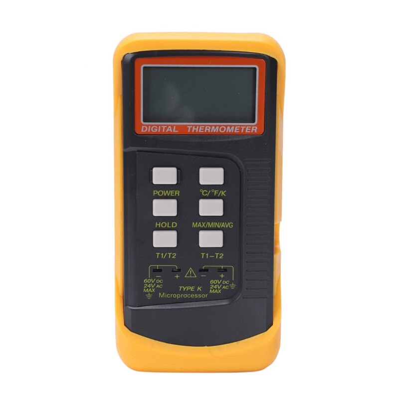 Professionelle Temperaturmessung war noch nie so einfach! Dieses digitale K-Typ Thermometer mit zwei Kanälen ist der perfekte Helfer für alle Messaufgaben. Mit einem riesigen Messbereich von -50°C bis 1300°C (-58°F bis 2372°F) ist es für fast jede Anwendung geeignet. Die beiden mitgelieferten Thermoelemente messen von -50°C bis 400°C und liefern präzise Ergebnisse. Du kannst zwischen °C, °F und K umschalten - ganz wie du willst! Besonders praktisch: Die T1-T2 Funktion zeigt dir die Temperaturdifferenz zwischen beiden Sensoren an. Dazu kommen Max/Min/Durchschnittswerte, Datenhaltefunktion und automatische Abschaltung. Das Gerät läuft mit Batterien, hat einen klappbaren Standfuß und ist damit super mobil. Das abnehmbare Silikon-Schutzhülster schützt vor Stößen und verlängert die Lebensdauer. Mit der einfachen 6-Tasten-Bedienung kommt jeder sofort zurecht - ob Anfänger oder Profi. Perfekt für Werkstatt, Labor, Küche oder Hobbybereich. Einfach einschalten und losmessen!