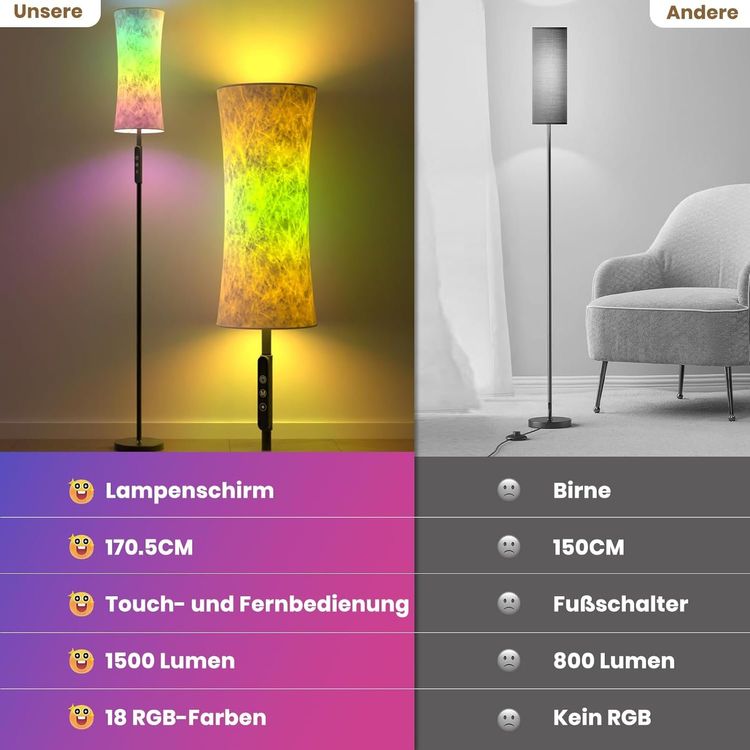 Wow, diese FUYO Stehlampe bringt richtig Stimmung in dein Zuhause! Mit satten 140 cm Höhe ist sie ein echter Hingucker im Wohnzimmer, Schlafzimmer oder auf dem Balkon. Die Besonderheit: Du kannst zwischen gemütlichem Warmweiß (3000K) und frischem Kaltweiß (6000K) wählen - oder bunt! Das RGB-Licht bietet 16 Millionen Farben für jede Stimmung. Per App oder Sprachsteuerung (Alexa/Google) steuerst du die Lampe komplett ohne Aufstehen. Dimmen, Farben wechseln, Timer einstellen - alles kein Problem! Die E27-Fassung nimmt energiesparende LED-Lampen bis 9W auf. Der stabile Metallsockel steht sicher und kippt nicht um. IP20 geschützt für den Innenbereich. Einfach zusammenschrauben, Lampe rein und schon hast du professionelle Beleuchtung! Perfekt für Filmabende, Romantik-Dinner oder einfach zum Entspannen. Die Fernbedienung macht die Bedienung super easy. Modernes Design, das zu jedem Einrichtungsstil passt. Einfach anschließen und die magische Lichtwelt genießen!