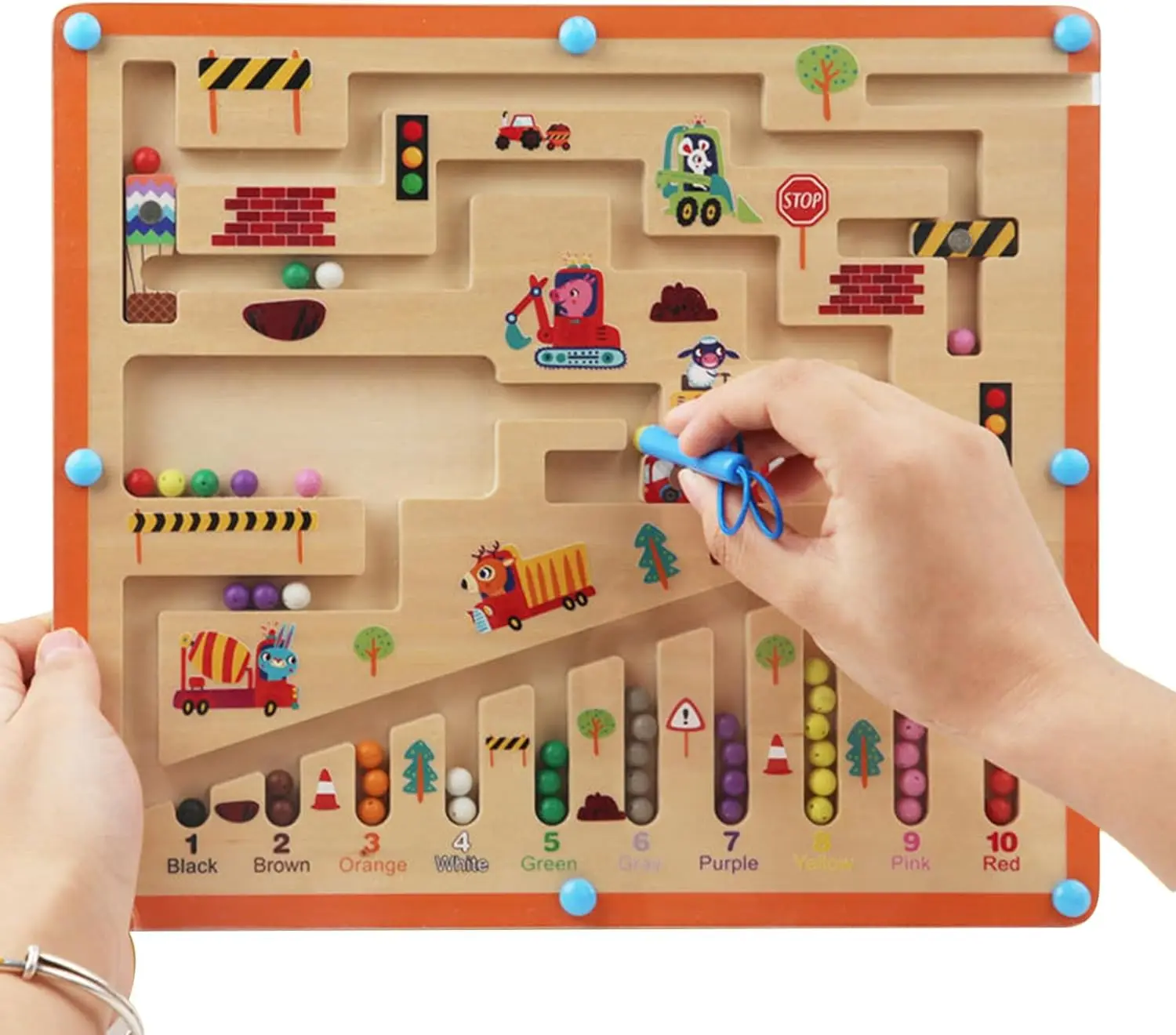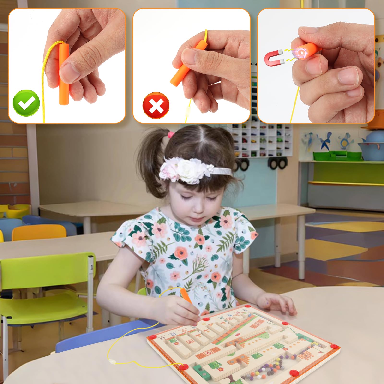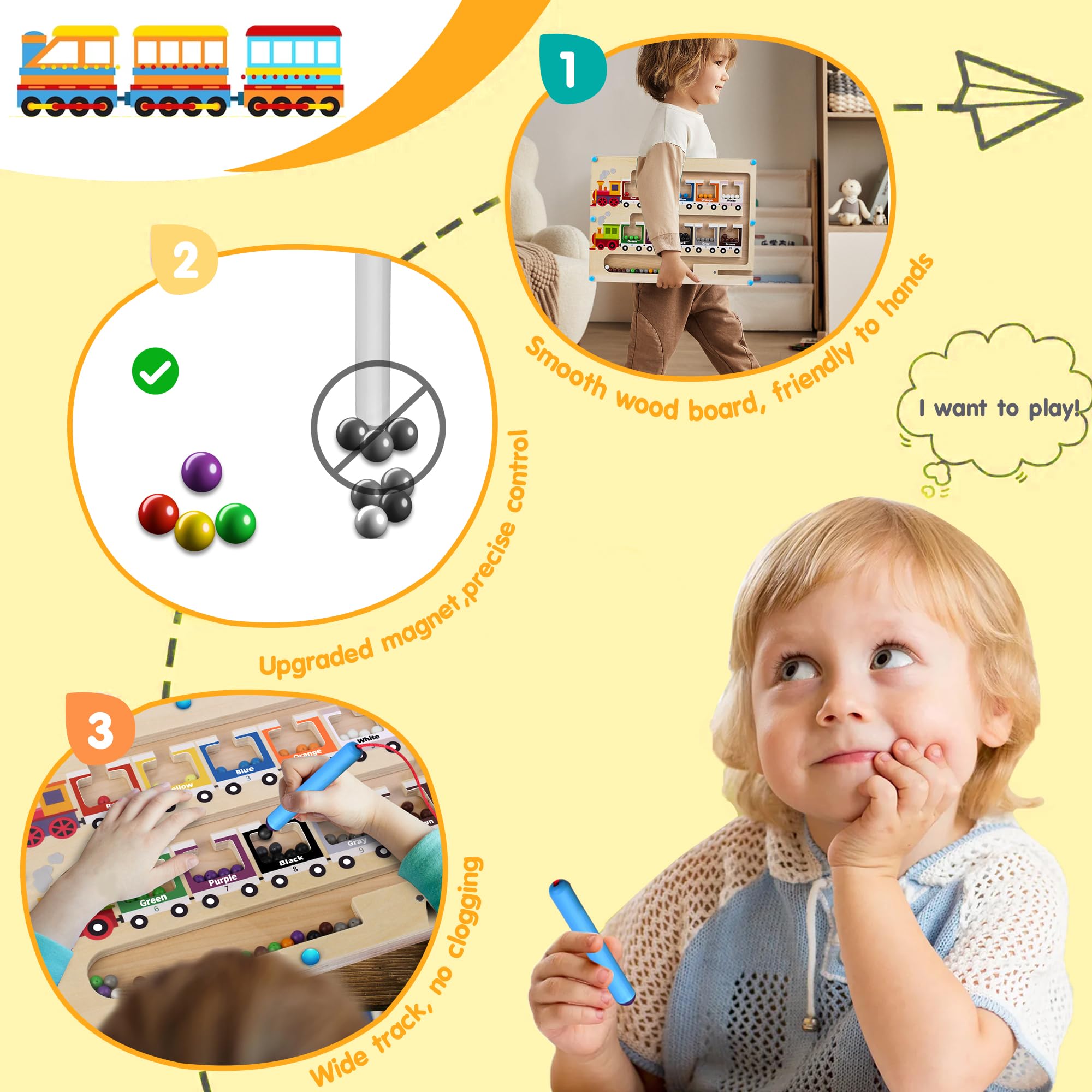Wow, was für ein cooles Lernspielzeug! Dieses magnetische Zahlenlabyrinth mit süßen Dinosaurier-Babys begeistert garantiert jedes Kind ab 3 Jahren. Stell dir vor: Dein Kind kann 10 verschiedene Dinosaurier-Babys 'füttern' und lernt dabei spielerisch Farben, Zahlen und verbessert die Hand-Auge-Koordination!\n\nDas stabile Holzbrett ist durch eine Acryl-Abdeckung geschützt - keine verlorenen Teile mehr und super einfach zu reinigen. Mit einem Gewicht von 1,15 Pfund ist es robust aber dennoch leicht genug, um es überall mitzunehmen.\n\n65 Magnetkugeln in verschiedenen Farben warten darauf, mit dem Magnetstift bewegt zu werden. Die verbesserte Magnetkraft sorgt dafür, dass immer nur eine Kugel aufgenommen wird - kein lästiges Verheddern!\n\nWas die Kinder lernen: Farbenerkennung mit 10 verschiedenfarbigen Dinosauriern, Zahlen von 1 bis 10 für jede Farbe, und vor allem die Feinmotorik wird super trainiert. Perfekt als Vorbereitung auf die Schule!\n\nDas Dinosaurier-Thema kommt bei Kindern immer gut an! Die süßen Dino-Babys mit offenem Mund machen das Spielen noch spannender. Dein Kind wird stundenlang beschäftigt sein und dabei ganz nebenbei lernen.\n\nMaße von 11,2 x 8,8 x 0,9 Zoll machen es handlich für kleine Kinderhände. Die glatten Kanten sind sicher und die gute Polierung schützt vor Verletzungen.\n\nAls Geschenk ist es einfach perfekt! Zum Geburtstag, Weihnachten, Kindertag oder einfach so - dieses Lernspielzeug kommt immer gut an. Es fördert die Entwicklung und macht dabei noch riesigen Spaß!\n\nEgal ob zu Hause, im Kindergarten oder unterwegs - dieses Spielzeug ist immer eine gute Wahl. Einfach mal ausprobieren und zusehen, wie dein Kind mit Begeisterung lernt!