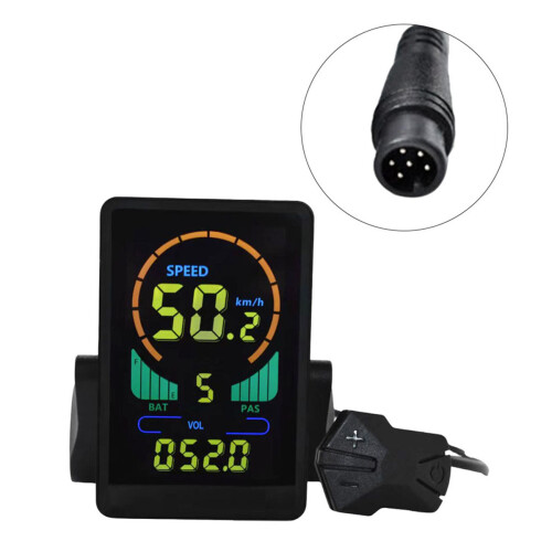 Modernes LCD-Display für dein E-Bike! Das Azull H6C-2 ist IP67 wasserdicht und passt für 24V/36V/48V/60V Systeme. Zeigt alles an: Geschwindigkeit, Akku-Stand, Kilometer, Laufzeit und mehr. Mit Boost-Funktion und Scheinwerfersteuerung. USB-Aufladung (5V/500mA) für dein Handy. Passt auf 22,2-31,8mm Lenker. Einfache Installation, UART Kommunikation. Macht dein E-Bike komplett! Schwarz, aus Kunststoff, 71,3x116,1mm. Sieht sleek aus und ist super funktional.