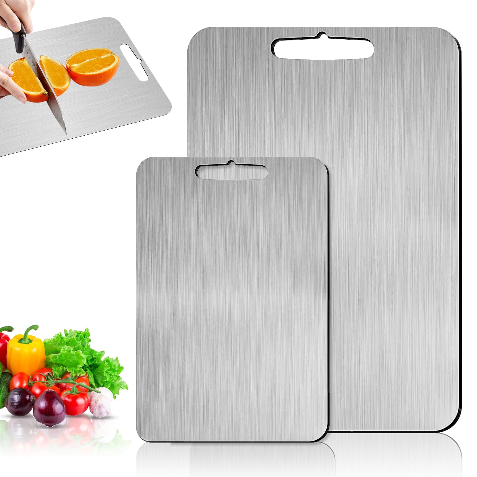 Endlich Ordnung in der Küche! Dieses 2er Set Titan-Schneidebretter in 23x34cm und 28x39cm ist perfekt für alle Schneidearbeiten. Beide Seiten nutzbar - ideal zur Trennung von Fleisch, Gemüse und Obst! Das Titan-Material hinterlässt keine Dellen, nimmt keine Gerüche an und ist super einfach zu reinigen. Einfach mit Wasser abspülen und fertig! Die rutschfeste Oberfläche gibt sicheren Halt, und die stabile Struktur macht die Bretter langlebig. Kein Verziehen, keine Messermarken - einfach praktisch und hygienisch! Ein Muss für jede Küche, ob für Hobbyköche oder Profis.