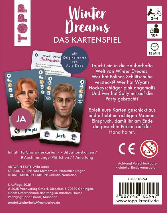 Hey, kennst du schon die Winter Dreams-Reihe von Ayla Dade? Dann ist dieses Kartenspiel genau dein Ding! Tauch ein in die romantische Welt der Bücher und mach dich auf die Suche nach der einen richtigen Person. So funktioniert's: Jeder bekommt 4 Charakterkarten und abwechselnd macht ihr Zeugenaussagen, die bestimmte Eigenschaften der gesuchten Person ausschließen. Aber Vorsicht - nicht alles, was gesagt wird, ist auch wahr! Die anderen Spieler müssen dann abstimmen, ob sie der Aussage glauben oder nicht. Sobald jeder nur noch zwei Karten auf der Hand hat, wird ausgewertet. Wer die wertvollste nicht ausgeschlossene Karte besitzt, gewinnt! Das Spiel ist super schnell gelernt - in 15 Minuten ist eine Runde durch - und macht mit 2-4 Spielern ab 10 Jahren richtig Spaß. Im Set sind 18 Charakterkarten, 7 Storykarten, 9 Abstimmungsmarker und eine Anleitung. Perfekt für Spieleabende mit Freunden, gemütliche Abende zu zweit oder als Geschenk für alle Fans von romantischen Geschichten. Einfach die Karten mischen und loslegen - wer wird wohl die gesuchte Person finden?