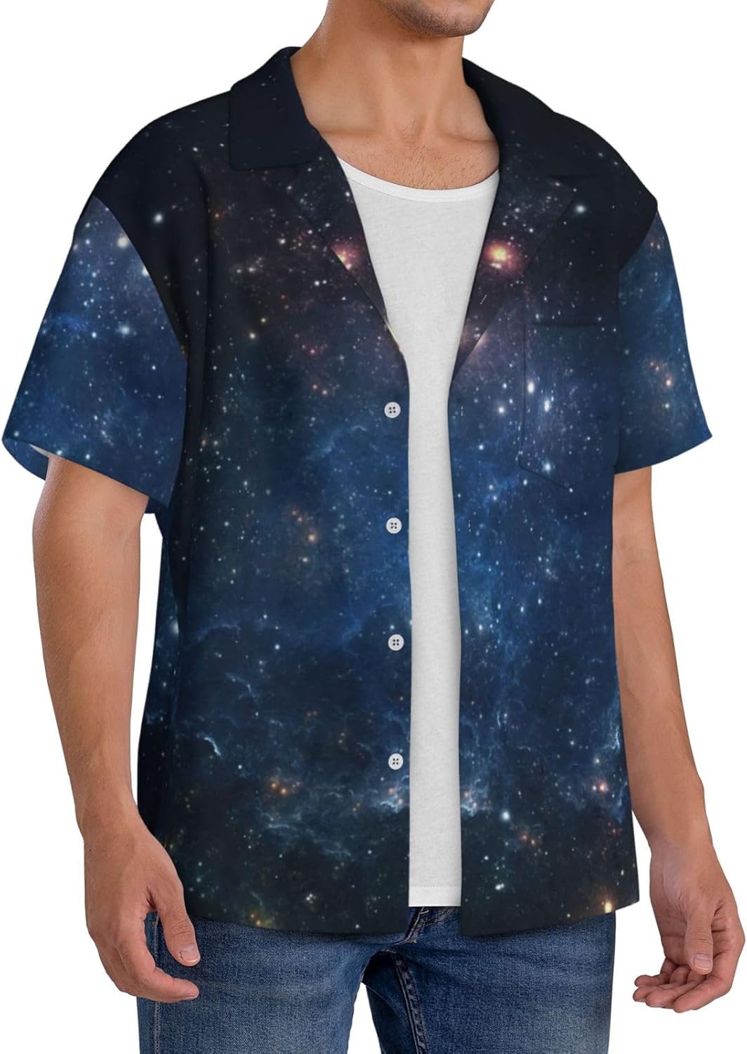 Ab in die Galaxie! Dieses coole Herrenhemd mit Galaxie- und Universum-Druck ist ein echter Hingucker. Mit kubanischem Kragen, Knopfleiste und kurzen Ärmeln sitzt es lässig und comfortable.