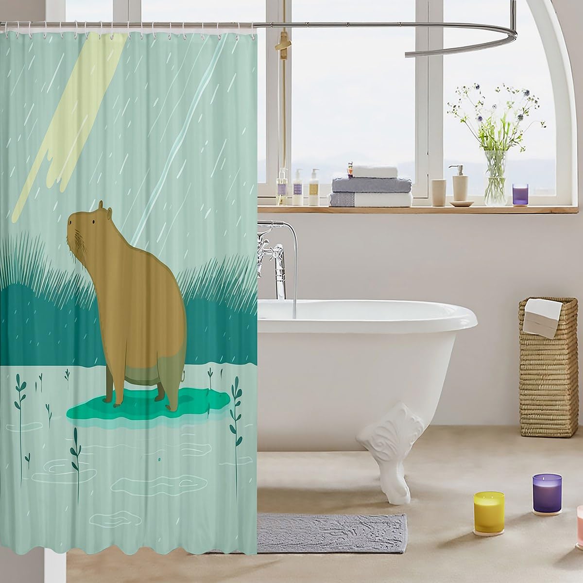 Wie süß ist denn dieser Duschvorhang? Mit den chilligen Capybaras im Dschungel-Design macht duschen gleich doppelt Spaß! Aus reinem Polyester - super leicht und komplett wasserdicht. 157x183cm groß - passt an fast jede Duschstange. Mit 12 praktischen Haken dabei - einfach aufhängen und fertig! Maschinenwaschbar - die Farben bleichen nicht aus. Sieht aus wie digital gedruckt - die Motive sind richtig scharf. Perfekt fürs Badezimmer, Gäste-WC oder sogar für Hotelzimmer. Bringt richtig tropisches Flair in dein Bad! Einfach aufhängen und sich über den neuen Look freuen!