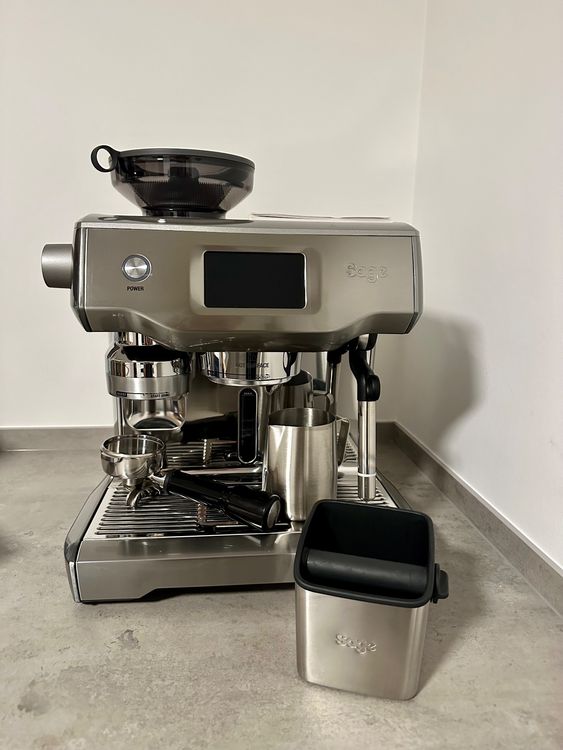 Café-Qualität für Zuhause! Die Sage The Oracle Dual Boiler bringt die Kunst der Kaffeezubereitung in deine Küche. Vollautomatisch, aber mit allem was Profis lieben - in einem Gerät.\n\nWas diese Maschine einzigartig macht:\n• Dual Boiler System - Espresso und Milch gleichzeitig\n• 45 Mahlgradeinstellungen - für perfekten Geschmack\n• 58mm Siebträger - professioneller Standard\n• Automatischer Milchaufschäumer - manuell oder automatisch\n\nFeatures die begeistern:\n• Integriertes Kegelmahlwerk - mahlt frisch vor jeder Zubereitung\n• Automatisches Tampern - immer der perfekte Druck\n• LCD Display mit intuitiver Bedienung\n• 16 Programme für verschiedene Kaffeevarianten\n• Volumetrische oder zeitgesteuerte Extraktion\n\nPerfekt für:\n• Kaffee-Enthusiasten die Wert auf Qualität legen\n• Haushalte die verschiedene Kaffeearten lieben\n• Alle die Latte Art lernen möchten\n• Genießer die keine Kompromisse wollen\n\nWarum die Oracle so besonders ist:\n• In unter 1 Minute von Bohnen zu Milchkaffee\n• Perfekter Mikroschaum für kunstvolle Verzierungen\n• Temperaturkontrolle für optimalen Geschmack\n• Individuelle Anpassung aller Parameter\n• Einfache Reinigung und Wartung\n\nVon Espresso über Cappuccino bis Flat White - mit der Oracle meisterst du jede Kaffee-Kreation. Einfach Bohnen einfüllen, Programm wählen und genießen!\n\nTechnik die überzeugt: Edelstahl-Gehäuse, professionelle Komponenten und deutsche Wertarbeit machen diese Maschine zu einem Begleiter für viele Jahre.