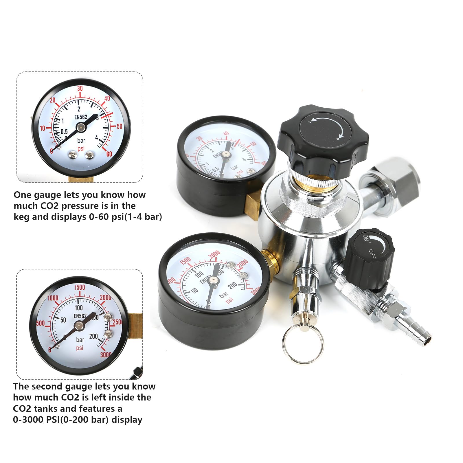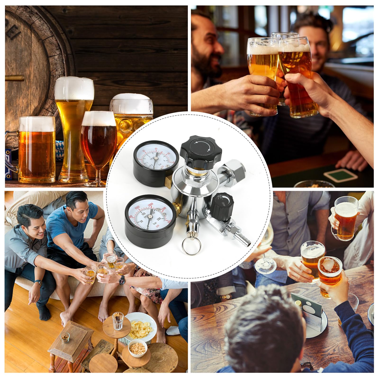 Profi-Biergenuss für zu Hause? Mit diesem CO2 Druckminderer mit zwei Manometern wird's möglich! Der W21.8 Standardanschluss passt perfekt zu den meisten Bierzapfanlagen. Die beiden Anzeigen zeigen dir genau, was Sache ist: eins für den Ausgangsdruck (0-60 PSI) und eins für den Tankdruck (0-3000 PSI). So siehst du immer, wie viel CO2 noch da ist und ob alles optimal läuft. Aus verchromtem Messing gebaut, hält das Teil ewig und sieht dabei noch richtig professionell aus. Der intuitive Einstellknopf macht die Druckregelung super einfach - kein Werkzeug nötig! Perfekt fürs Heimbrauen, ob Soda, Sprudelwasser oder dein eigenes Bier. Mit dem Sicherheitsventil, das bei 45 PSI auslöst, bist du immer auf der sicheren Seite. Ob für die Hausbar, Restaurant oder Brauerei - damit wird jedes Getränk zum Spitzenerlebnis!