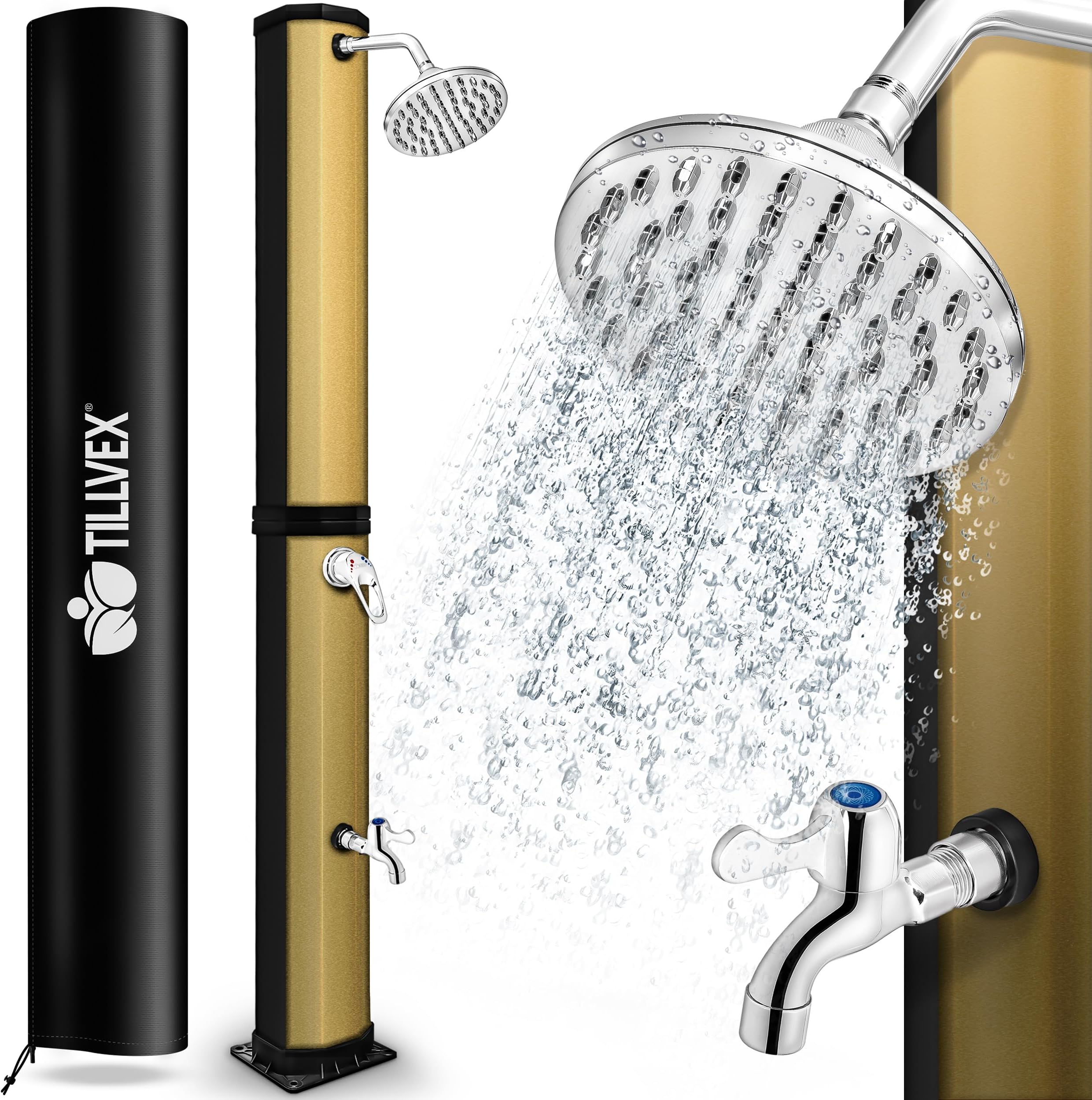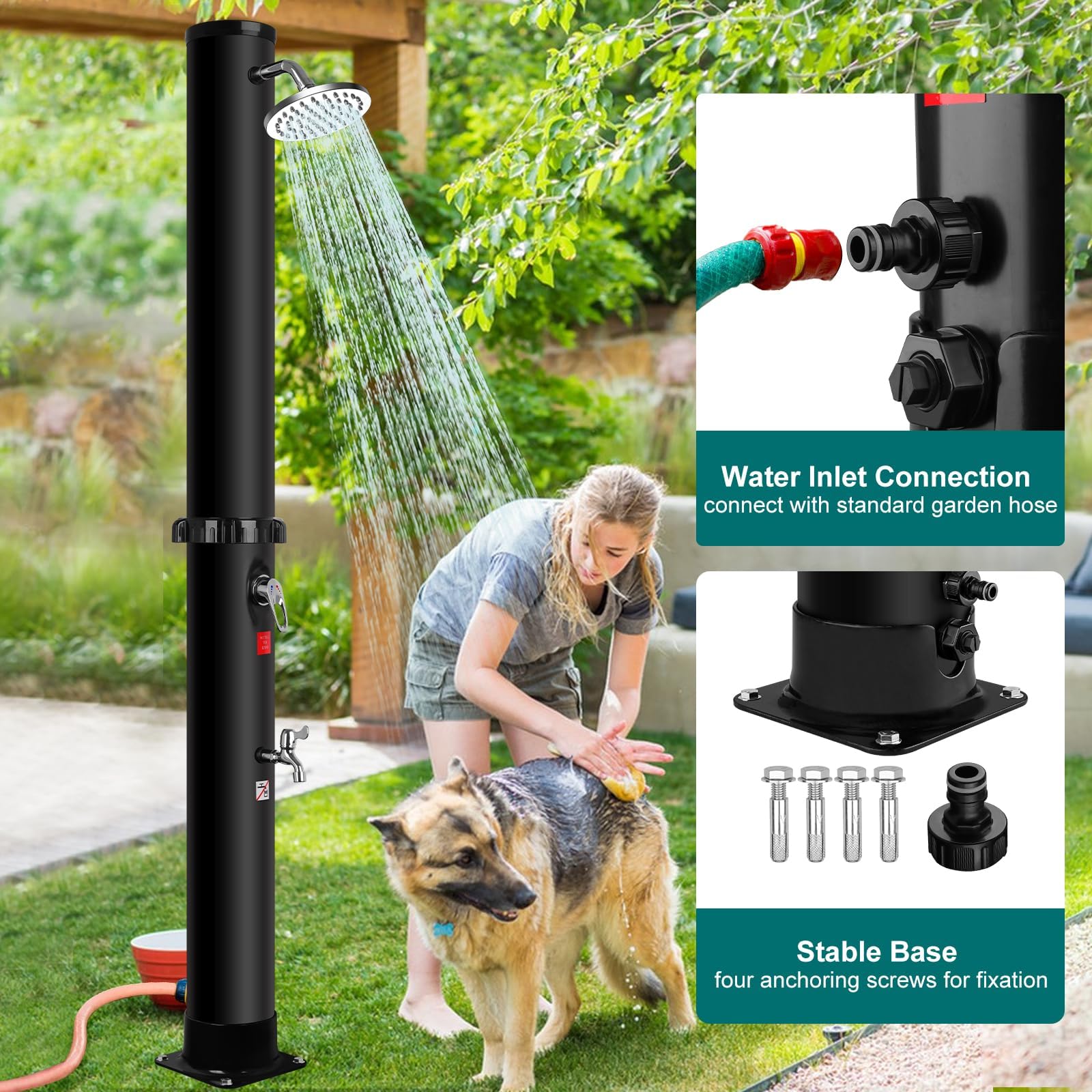Erfrischende Abkühlung im eigenen Garten! Diese Solardusche mit 35 Liter Tank macht's möglich. Das schwarze PVC-Material heizt das Wasser durch Sonnenenergie auf - bis zu 60°C warm! Ohne Stromkosten, komplett umweltfreundlich. Mit 216 cm Höhe passt sie für Groß und Klein. Der verstellbare Duschkopf und praktische Fußhahn sind super fürs Abspülen von Sand oder zum Haustiere waschen. Kalt-/Warmwasser-Regler für die perfekte Temperatur. Einfach an den Gartenschlauch anschließen und losduschen! Perfekt nach dem Schwimmen im Pool, beim Camping oder einfach für eine erfrischende Dusche an heißen Tagen. Leicht zu montieren und wieder abzubauen. Dein persönliches Spa-Erlebnis im Freien!