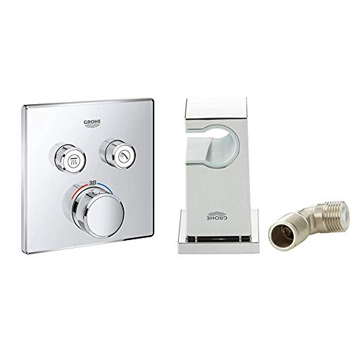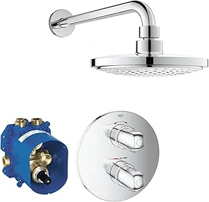 Duschvergnügen auf Profi-Niveau! Dieses GROHE Grohtherm Komplettset hat alles was dein Badezimmer braucht. Inklusive Thermostat-Regler, 210mm Kopfbrause, 100mm Handbrause und 1,5m Schlauch - einfach alles dabei! Das Thermostat hält die Temperatur konstant, dank TurboStat-Technologie kein Frösteln mehr beim Duschen. Der SafeStop sorgt dafür, dass es nicht zu heiß wird (max. 38°C einstellbar). Die Kopfbrause mit Rain-Strahlart fühlt sich an wie warmer Sommerregen, die Handbrause hat zusätzlich den kräftigen Jet-Strahl. Mit EcoJoy sparst du Wasser ohne Komfortverlust. Die SpeedClean-Düsen bleiben kalkfrei - kein lästiges Putzen mehr! Die StarLight Chrom-Oberfläche glänzt wie neu und hält ewig. Montage? Ganz easy mit der QuickFix-Rosette. Made in Germany - Qualität die überzeugt! Hol dir dieses Premium-Duschsystem und verwandle dein Badezimmer in eine Wellness-Oase!