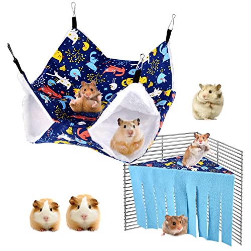 Deine kleinen Lieblinge verdienen es, gemütlich zu liegen! Diese Dyiouxin Hängematte im Doppelstock-Design ist der absolute Hit für Meerschweinchen, Hamster und andere Kleintiere. Aus weichem Samtstoff gefertigt - super bequem und langlebig. Maße ca. 34x34 cm - perfekt für die meisten Käfige. Das 2-in-1 Design: Oben chillen oder unten im Versteck abhängen - wie in der freien Wildbahn! Die vier Metallhaken machen die Montage im Käfig zum Kinderspiel. Spart Platz und gibt deinem Tierchen mehr Bewegungsfreiheit. Leicht zu waschen und wiederverwendbar. Egal ob für Meerschweinchen, Hamster, Mäuse oder andere kleine Fellnasen - diese Hängematte wird zum Lieblingsplatz. Dein Tier wird es dir danken mit fröhlichem Herumtollen und entspanntem Dösen. Mach den Käfig deines Lieblings noch gemütlicher - bestell jetzt und freu dich über ein glückliches Tier!