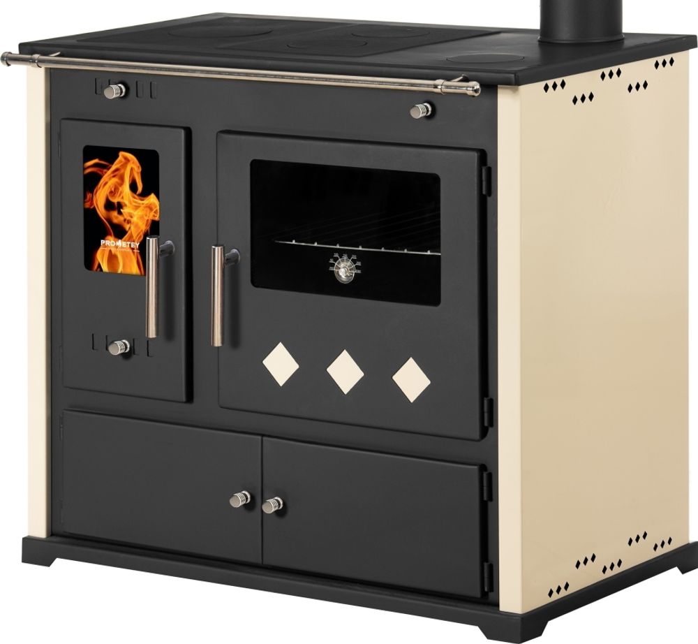 Dieser vielseitige Kaminofen ist ein echter Alleskönner! Der EEK A Viki Schwedenofen mit 10,5 kW heizt Wohnflächen bis 200m² und hat ein integriertes Backfach plus drei Kochplatten. Backe Brot oder koche ohne Strom - komplett autark! Mit Schamottstein ausgekleidete Brennkammer und praktischem Holzablager unter dem Ofen. Das Thermometer am Backofen hilft bei der Temperaturkontrolle. Maße: 87,4cm hoch, 93cm breit, 62,6cm tief. Rauchrohr Ø150mm, Wirkungsgrad 76,6%. Erfüllt die EN 12815 Richtlinien für Deutschland. Inklusive hitzebeständigem Handschuh und Bedienungsanleitung. Mit 122kg ein solides Stück Qualität, das Generationen hält!